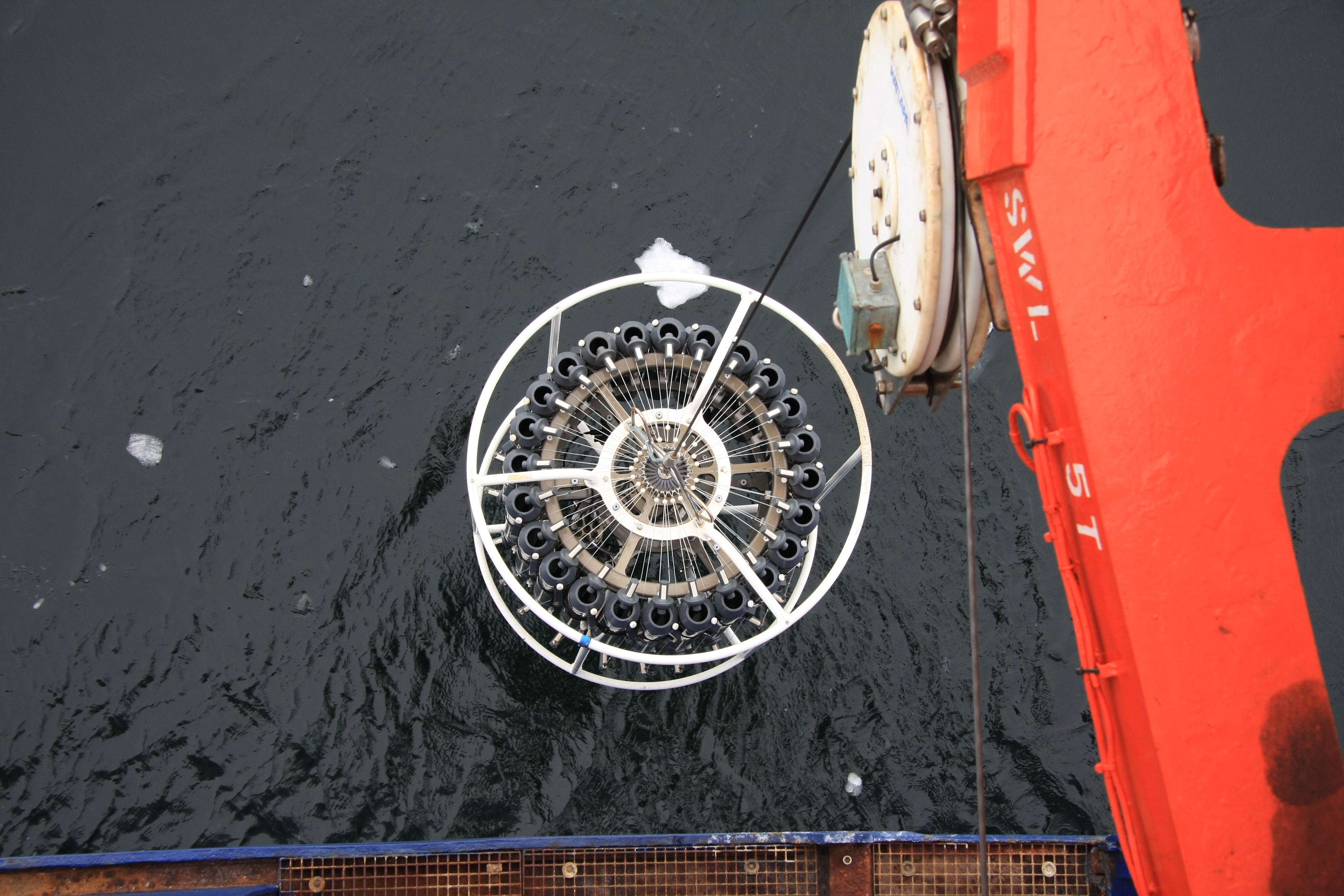 To address sampling bias in terms of estimating the diversity and biogeography of upper ocean phytoplankton microbiomes, in 2012 we began to sequence phylogenetic marker genes (16/18S rDNA) of Arctic phytoplankton communities with a focus on eukaryotic primary producers (microalgae) and their co-occurring bacteria. We complemented this taxonomic work with the sequencing of expressed microalgal genes (metatranscriptomics) to reveal polar-specific metabolic characteristics of oceanic primary producers. This work was mainly enabled by funding from the US Department of Energy Joint Genome Institute (JGI), the Natural Environment Research Council (NERC), and the Alfred-Wegener Institute (AWI) for Polar and Marine Research. RV 'Polarstern', a German icebreaker, was used as a research platform to sample the upper Arctic Ocean until 79°N near the east coast of Greenland. With help of the Polarstern crews, we were able to sample over 100 stations from pole to pole. For most samples, we utilised a CTD Rosette (Fig. 1) sampler allowing us to find the depths with the highest concentrations of phytoplankton.
