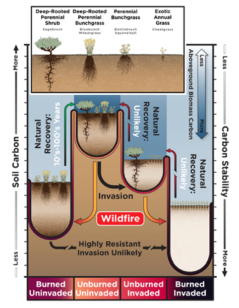 Prioritizing the protection of intact native perennial systems is critical for preventing further soil carbon loss and mitigating the impacts of climate change. Our findings have important implications for land management agencies tasked with safeguarding our public lands. Proactive land management strategies thatprotect native shrublands from annual grass invasion could keep existing carbon stores secure. Such actions not only avoid soil carbon losses, but also provide a host of other benefits, including improved wildlife habitat, increased forage production and reduced wildfire frequency.