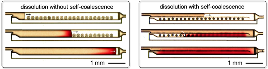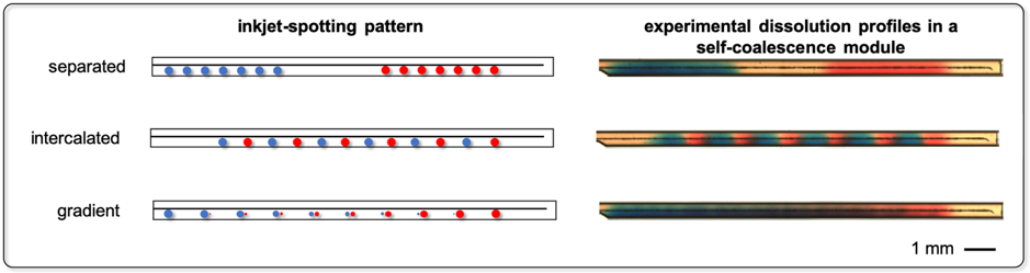 The observation of self-coalescence was the most important step forward but also the easiest: It really took the varied background of all of the authors on our paper and the great experimental skills of Onur Gökçe, who is the first author on the paper, to characterize, model and master this phenomenon. What can be done in terms of controlling the dissolution of reagents using self-coalescence and the microfluidic structure for implementing it (the “self-coalescence module”) is mostly limited by our imagination (and the time before unavoidable passive diffusion brings distant reagents into contact): we can realize a spotting map to deposit picogram quantities of reagents in a SCM using an inkjet spotter and model the resulting dissolved profile of the reagents very precisely. Different types of reagents can be integrated for performing locally distinct reactions. Or the reagents can be repeatedly spotted one next to another. Gradients can be formed, as well as mixing operation. SCMs can be used serially for multistep reactions or in parallel for multiplexed analysis. Solutions containing dissolved reagents can be sent out of a SCM for downstream analysis, etc.