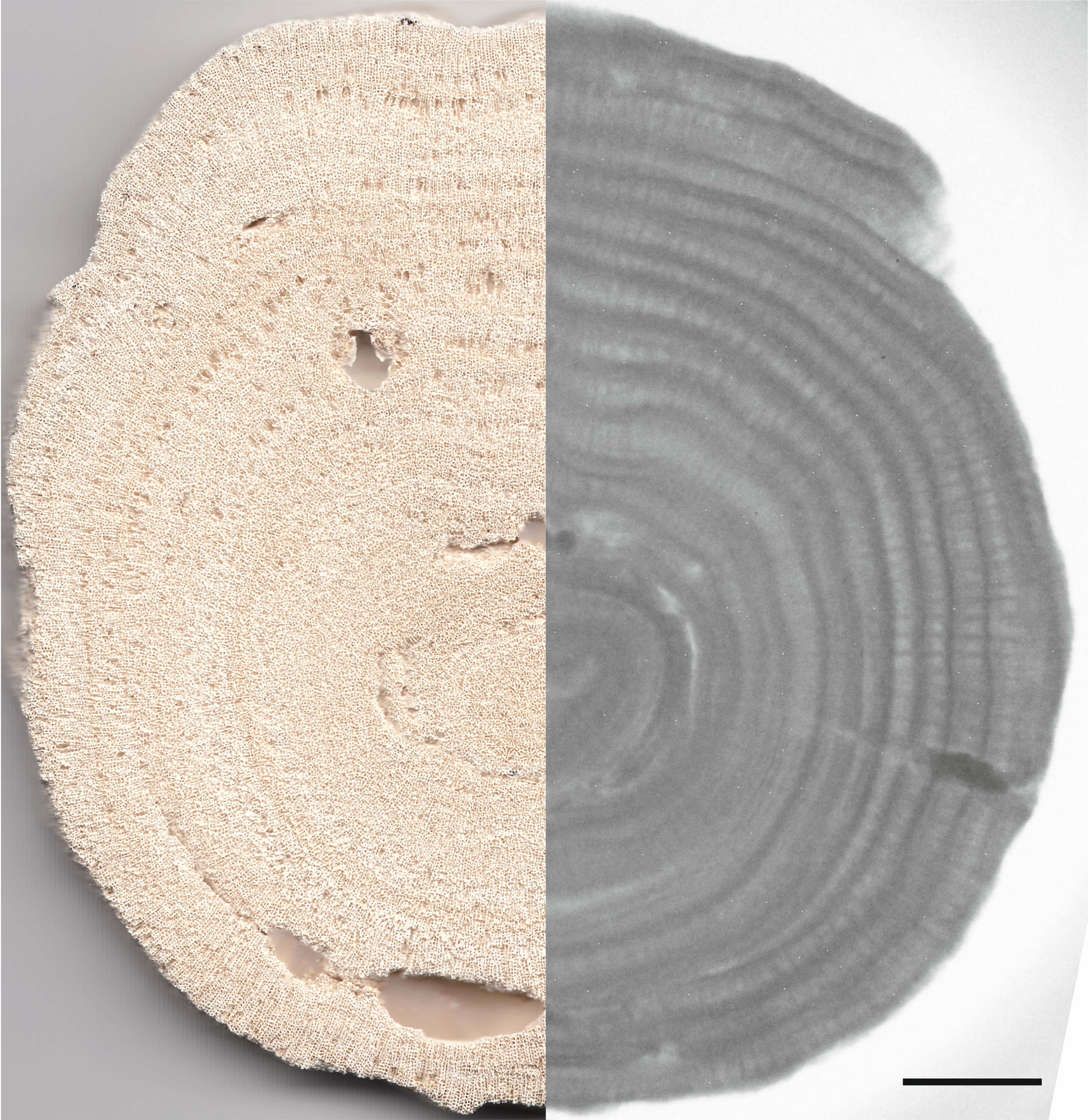 Miocene Porites corallith (rolling coral) in cross section (left) and X-ray image (right). In the X-ray image, alternating light and dark bands can be seen. These bands represent seasonal density differences in the coral skeleton, similar to the growth rings in trees. One light and one dark (denser) band together represent one year. The scale bar is one centimeter.