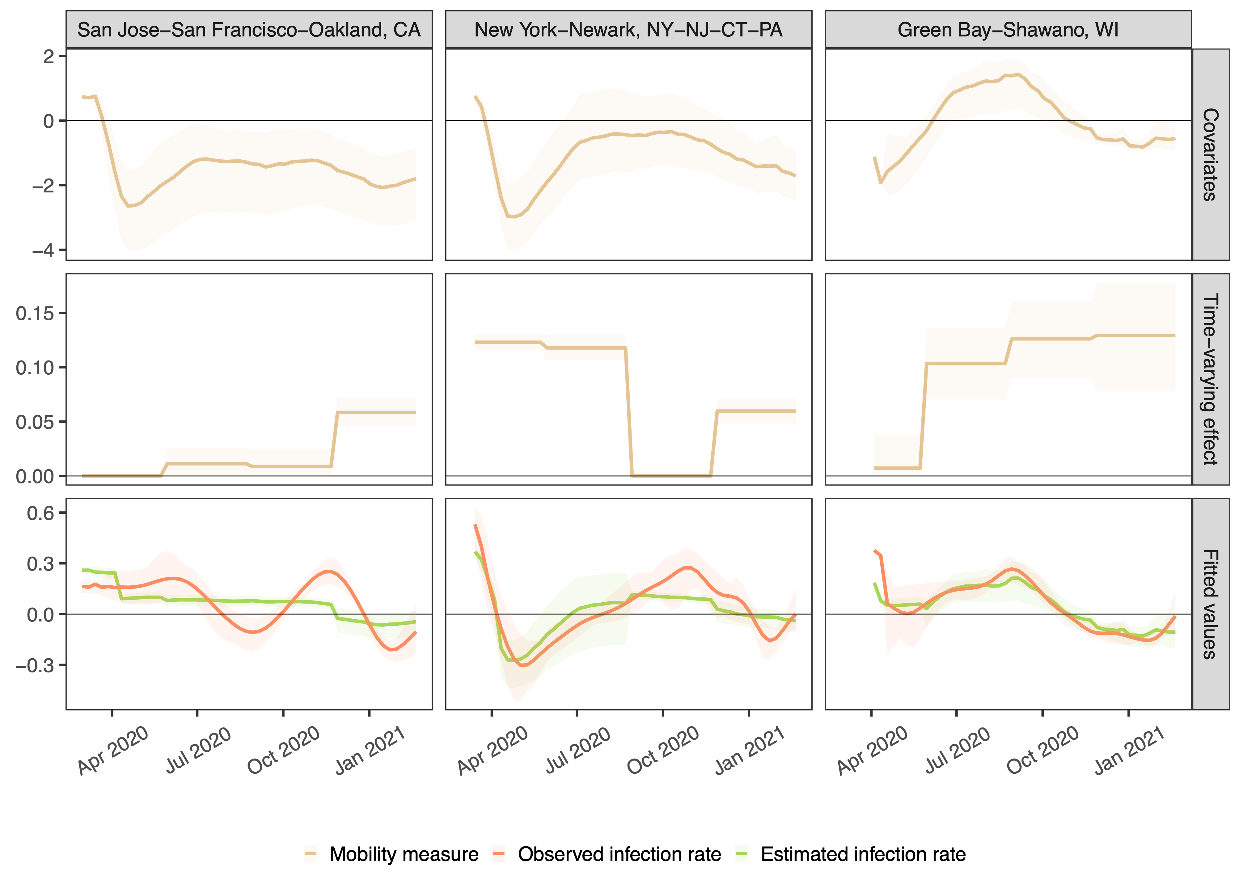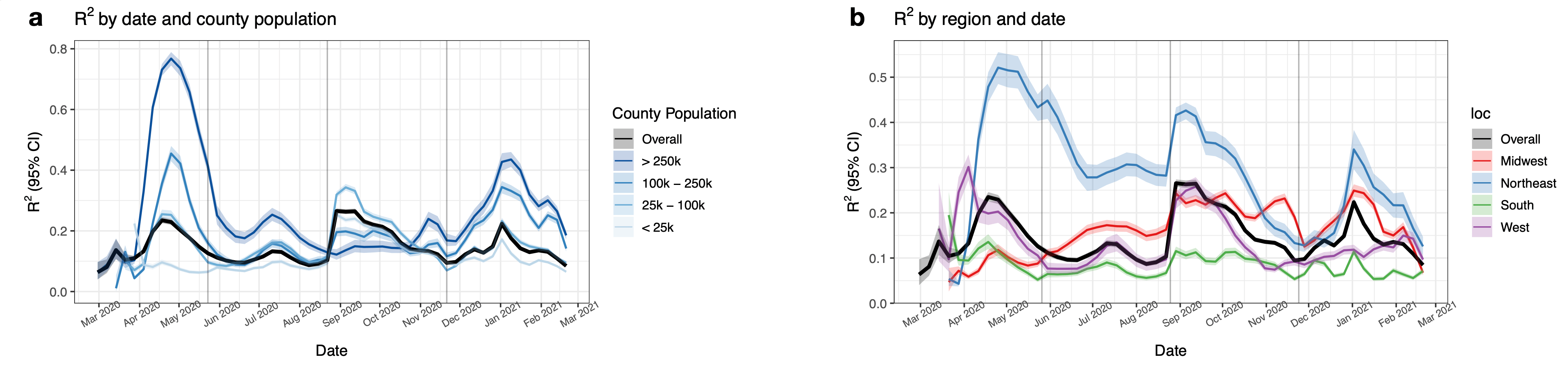 Using one year of data across 94% of all 3142 US counties corresponding to 99.7% of the population, we corroborate early findings that drops in mobility were associated with decreased COVID-19 incidence rates in the most populous counties in spring 2020. However, we show that this relationship is highly variable across time and geography. In Figure 1, we show cell phone mobility values, the estimated time varying effect between mobility and infection incidence, and the estimated model predictions for three illustrative metropolitan areas. We see that the estimated effect of mobility (second row) varies over time and by place. Figure 2 zooms out and displays aggregate model performance. Our model had the highest predictive power in spring 2020 in high population areas and especially in the Northeast. This relatively high predictive power dissipated as the pandemic evolved.