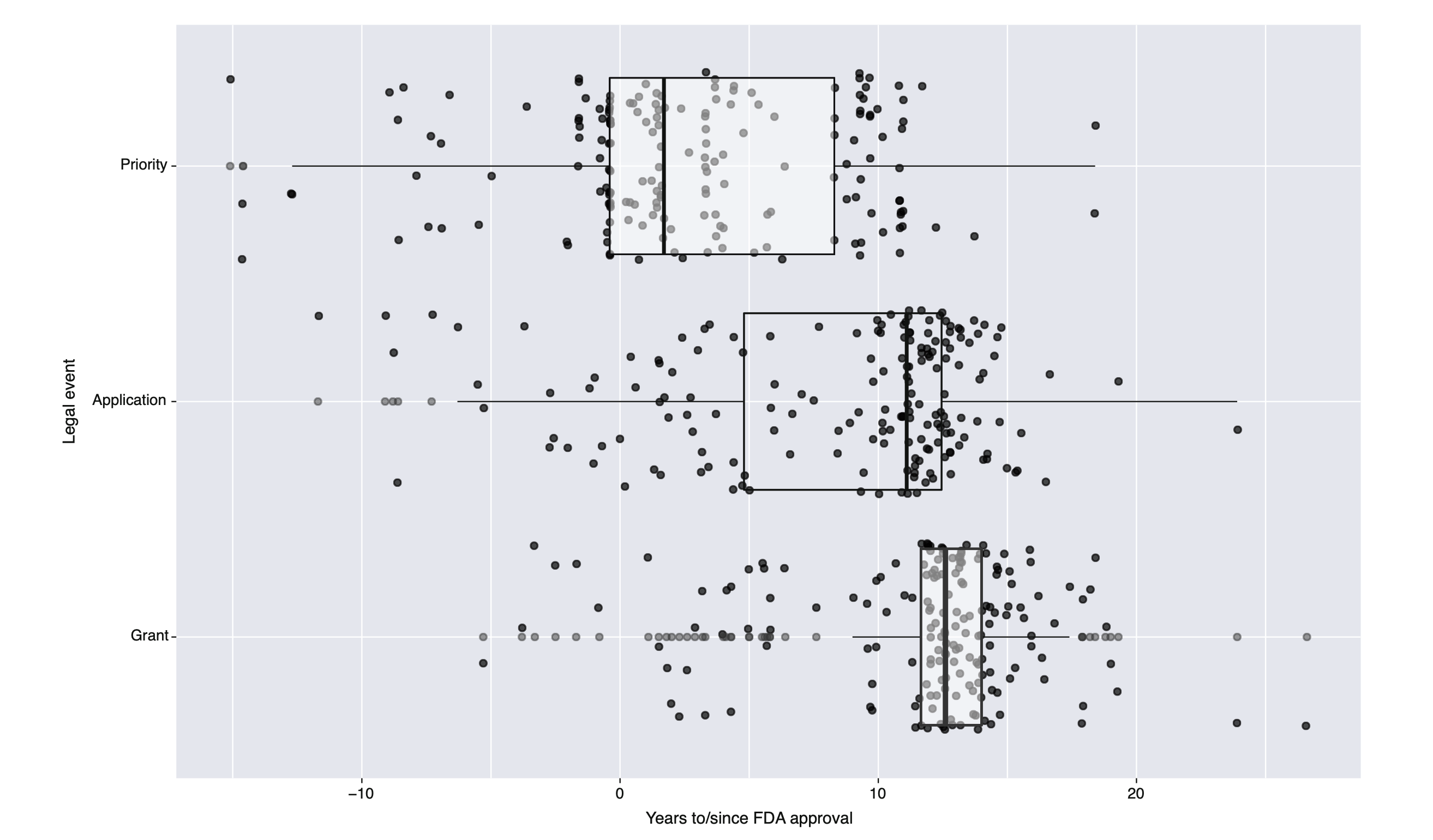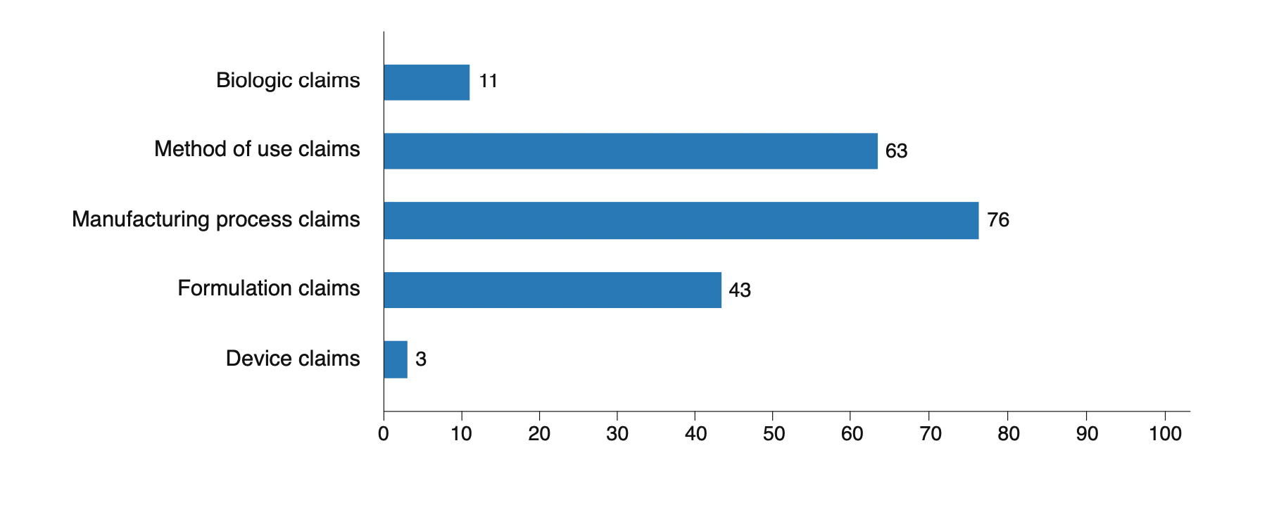 We examined 179 patents covering 21 cases involving 9 originator biologics: adalimumab (Humira), bevacizumab (Avastin), epoetin alfa (Epogen), etanercept (Enbrel), filgrastim (Neupogen), infliximab (Remicade), pegfilgrastim (Neulasta), rituximab (Rituxan), and trastuzumab (Herceptin). Only 11 (6%) patents covered an active ingredient in a biologic drug, while most covered uses or peripheral features of the drug, such as its manufacturing process (N=76, 42%) or formulation (N=43, 24%) (Figure 1). The median time of patent filing was over a decade after approval of the originator biologic (Figure 2).