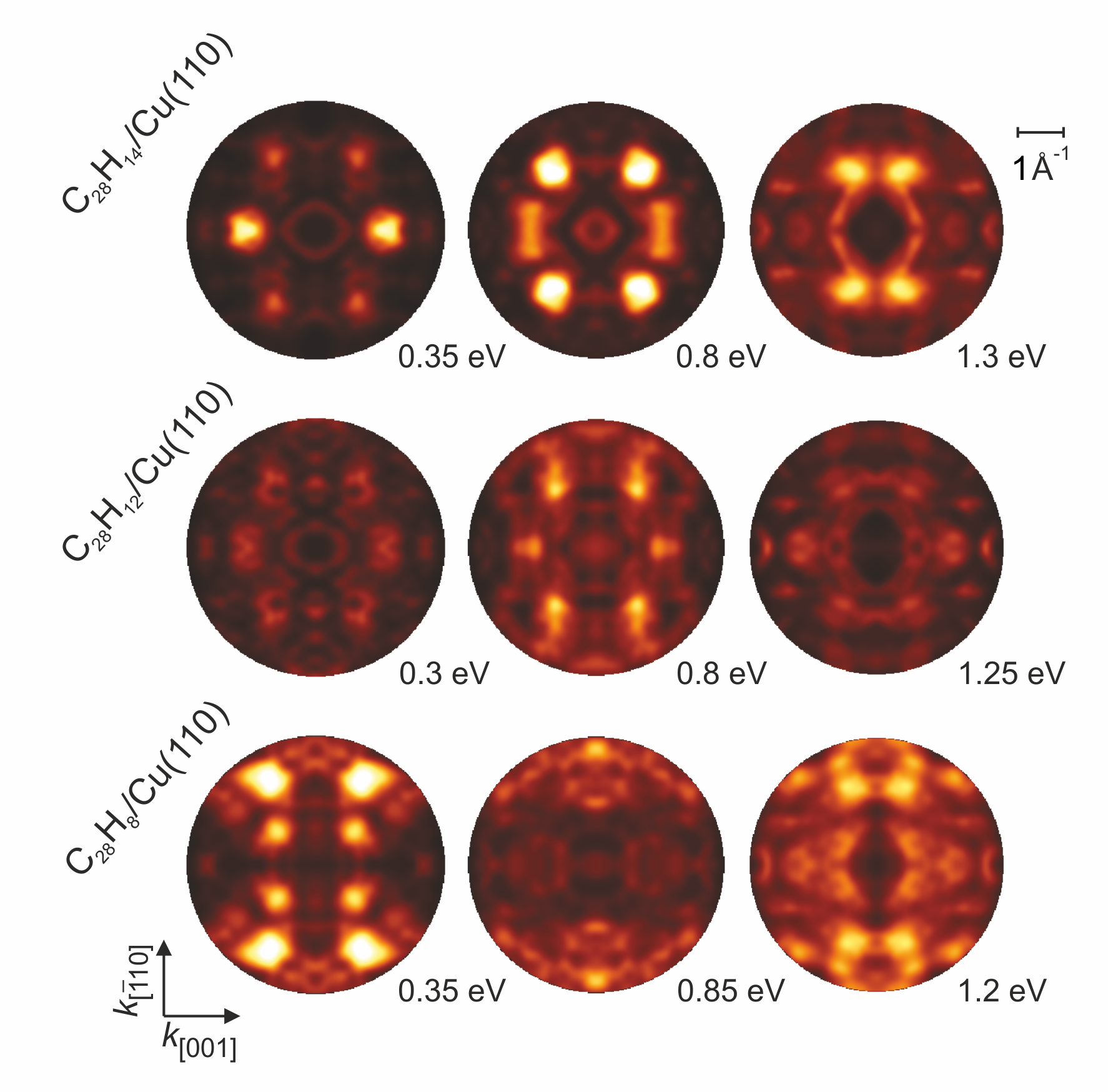 To clarify the chemical state of the intermediate, we compared the experimental k-maps to those of the three possible candidates: C28H14, C28H12 and C28H8. The latter two are in fact the partially dehydrogenated states of the former one, the planar pi-conjugated bisanthene often referred to as “nanographene”. Actually, for the surface reaction under study, C28H8 has been suggested earlier to be the intermediate. However, comparison of our theoretical k-maps for the two dehydrogenated species with our measured k-maps (Figure 2) allows us to exclude dehydrogenation of the intermediate and clearly indicate that intact bisanthene is formed on the surface.