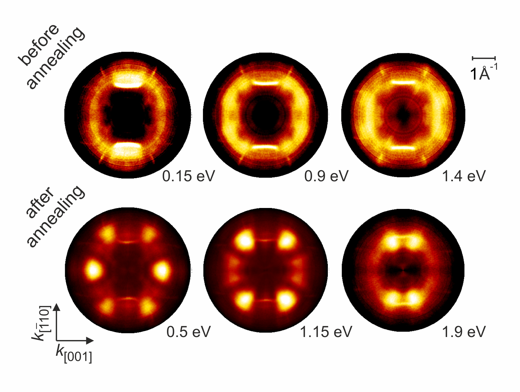 To prove this presumption we used the reaction of dibromo-bianthracene, which upon annealing at elevated temperatures, turns into graphene on Cu(110). As an intermediate step of this reaction, at 250°C the dibromo-bianthracene first transforms into an intermediate molecular specie. Comparing the k-maps before and after annealing, we observed a drastic change of the photoemission patterns (Figure 1) testifying that the reaction indeed happened and the new chemical specie appeared at surface. Furthermore, the more distinct k-maps after annealing prove that the reaction intermediate is better ordered on the surface.