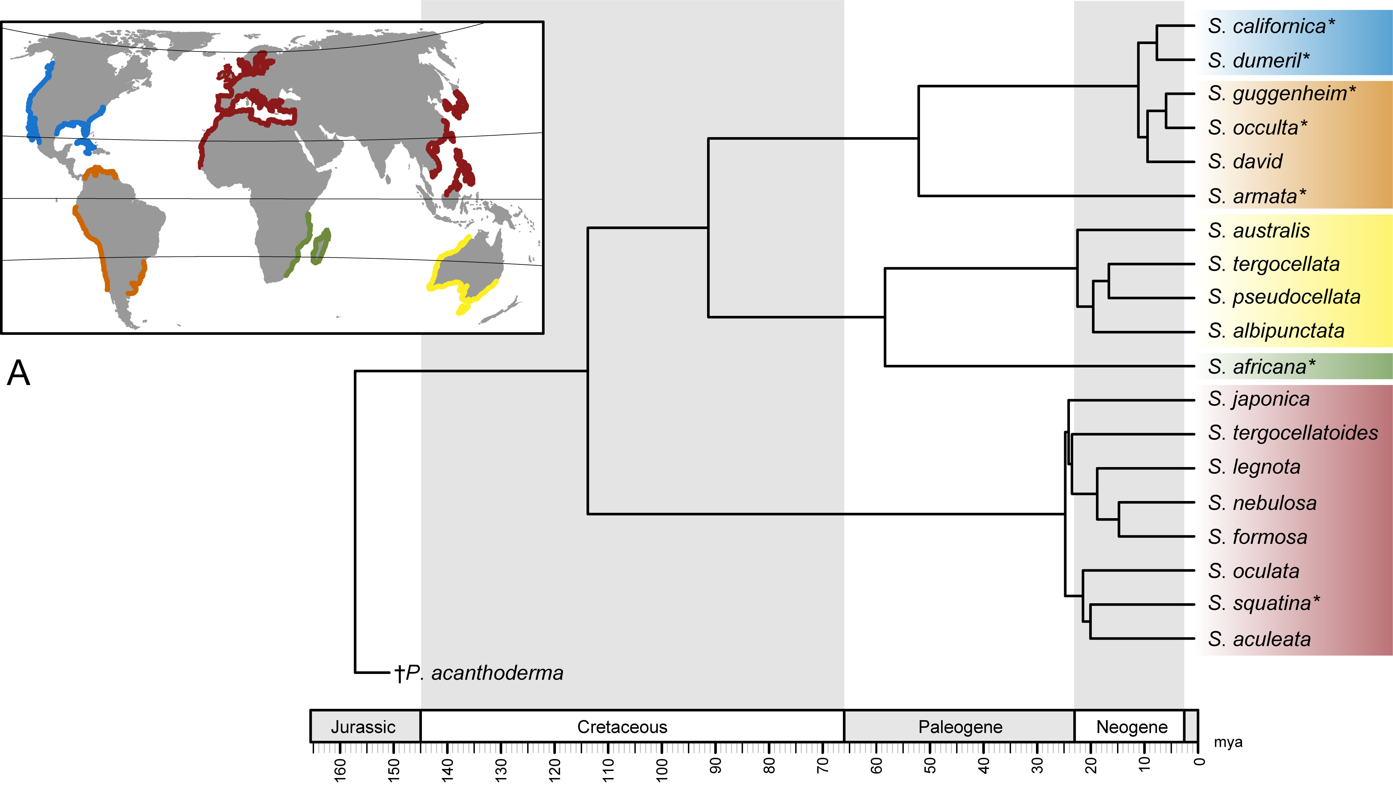My interest for angel sharks comes not only because of their unusual body shape, but also because the oldest complete fossils of this group (around 157 mya) are also very similar to the extant species. And while many other vertebrate groups show a wide variety of forms, the consistent body of angel sharks through time made me wonder about the possible causes.