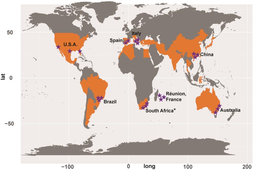 Geographic distribution of sampling sites across the world’s citrus producing regions. Purple stars, the sampling sites; orange, major citrus producing countries. Asterisk: only rhizosphere soil samples were collected.