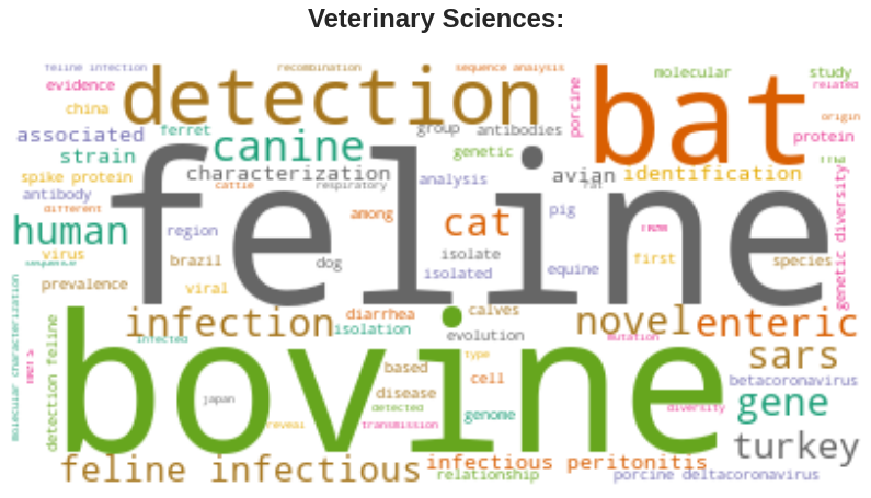 The first theme is dominated by animal-related words. A closer look at the fields of research codes used for these articles, as well as the journals in which they were published, showed that veterinary-related research was prominent. Hence, this theme was labeled “veterinary sciences”.