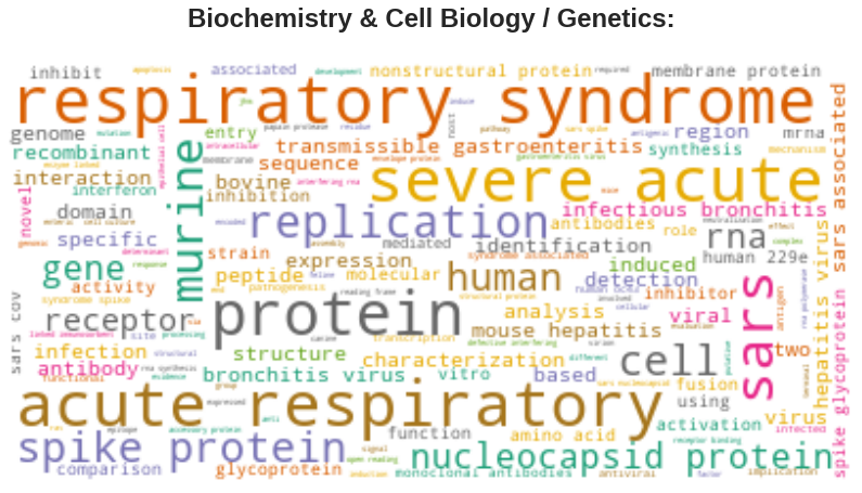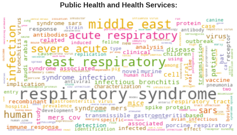Finally, we come to the public health and health services theme. As we would expect, the focus here is on the effects of the virus, and in the word cloud we see terms such as “acute” or “severe” and “respiratory syndrome”, along with “case”, “detection”, “infection”, “outbreak”, “patient”, and “vaccine”.