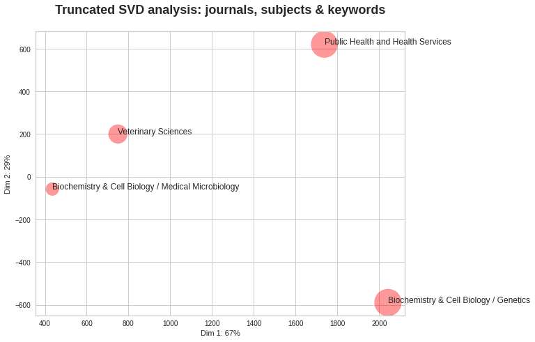 In this chart, we can see the relative distances between the themes on a map (the coordinates of the map are not directly interpretable). Each bubble is a theme, with a size proportional to the number of articles in it. The two axes in the plot correspond to two dimensions in the article data. On the east-west axis we see data involving animals on the left (recall the heavy presence of “murine” in the word cloud for the “Biochemistry and cell biology / medical microbiology” cluster), and the non-animal research on the right. In the north-south axis, it appears that we are looking at the distinction between public health and animal research versus more foundational research.