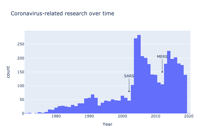 If we plot the number of research articles by year, a striking pattern emerges: there is a noticeable peak of research being published around 2004-2005, and another one around 2014. This happens to be just after the 2002-2003 SARS epidemic, and the 2012 MERS outbreak.