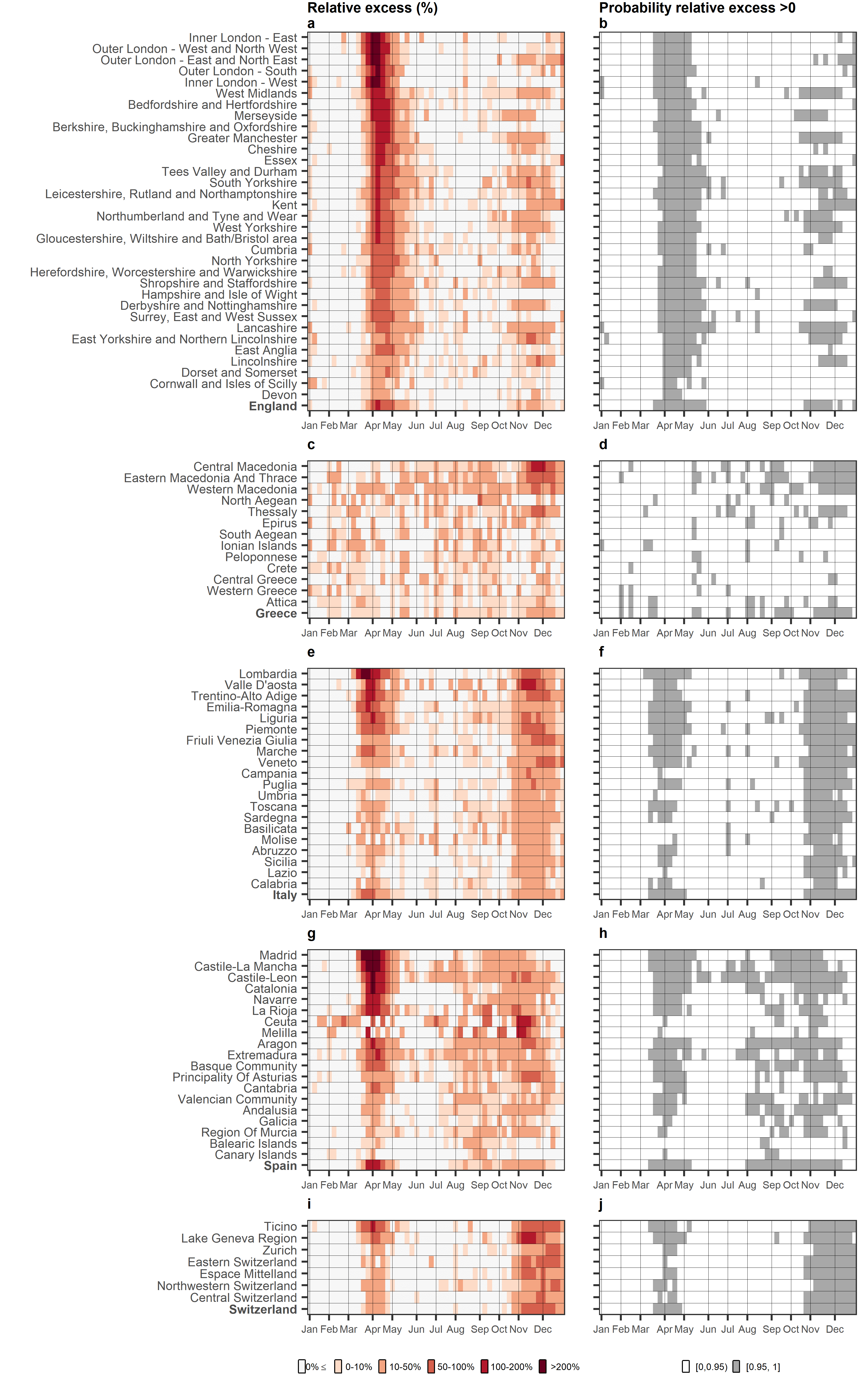 Figure 1 shows the percentage relative difference in the excess mortality and the probability that the excess mortality is greater than 0 for the different regions, for each week in 2020. A percentage relative difference of 10% means that the number of deaths in a particular week and region has increased by 10% relative to what we would have expected had the pandemic not occurred. Probabilities of a positive relative difference higher than 0.95 (grey pixel, left panel Figure 1) can be interpreted as strong evidence that a region during a particular week experiences more deaths compared to what was expected had the pandemic not occurred.