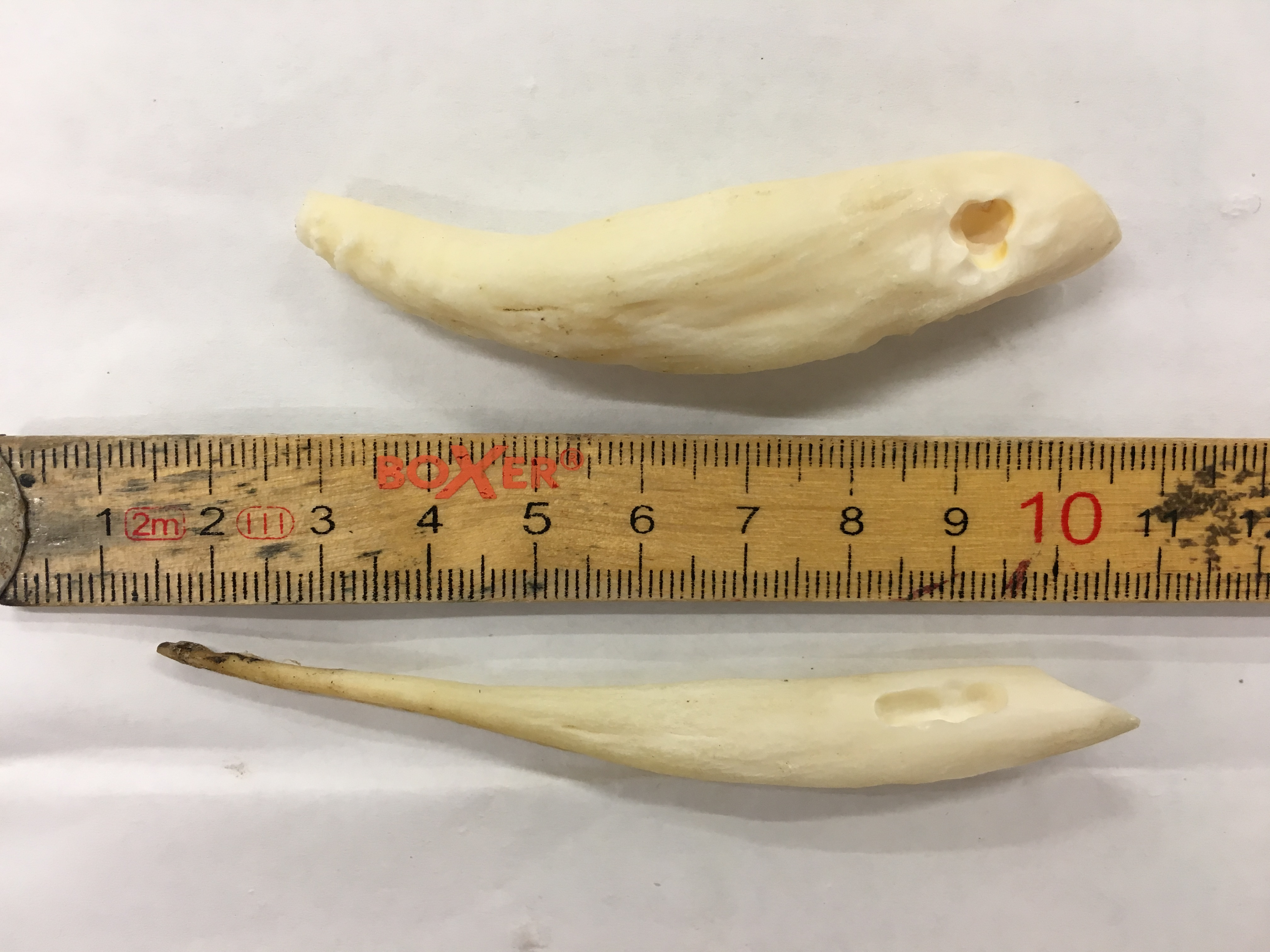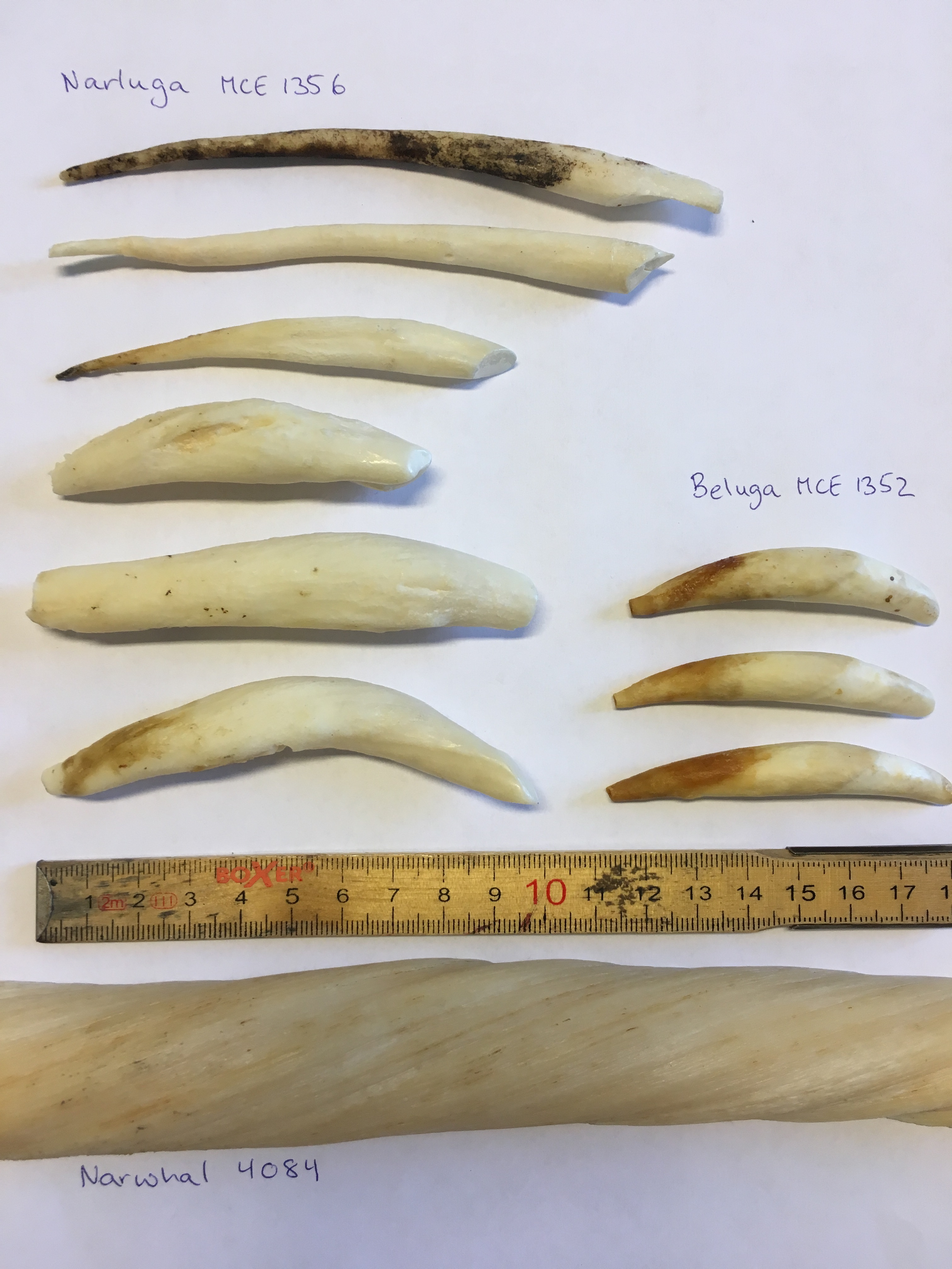 The skull looked like a mash-up of a narwhal and a beluga. They are the only toothed whales endemic to the Arctic, and each others’ nearest relatives. They diverged ~5 Mya, and recent work by my postdoc Mick Westbury on their genomes showed that gene flow ceased between the species at least 1.25 Mya. Although their ranges rarely overlap, both species migrate along the coast of West Greenland in winter, when the inuit subsistence hunts take place. By comparing the morphology of MCE1356 with a reference panel of narwhals and belugas, it was proposed that the skull either belonged to a narwhal/beluga hybrid, or to an unwitting beluga with weird dentition.