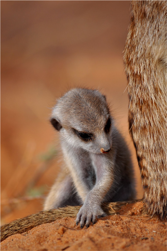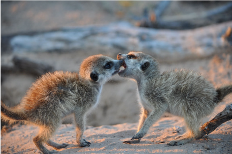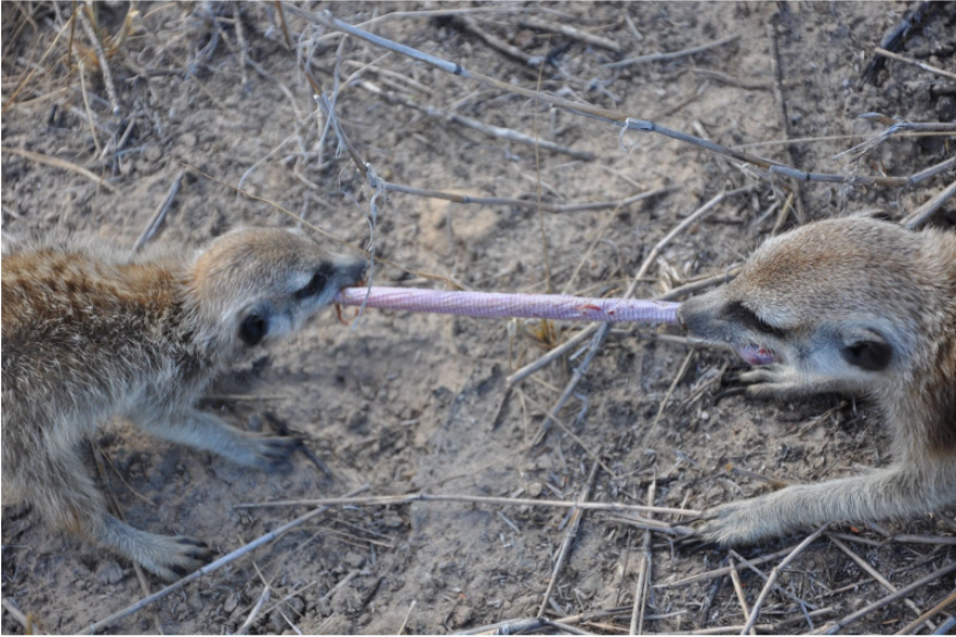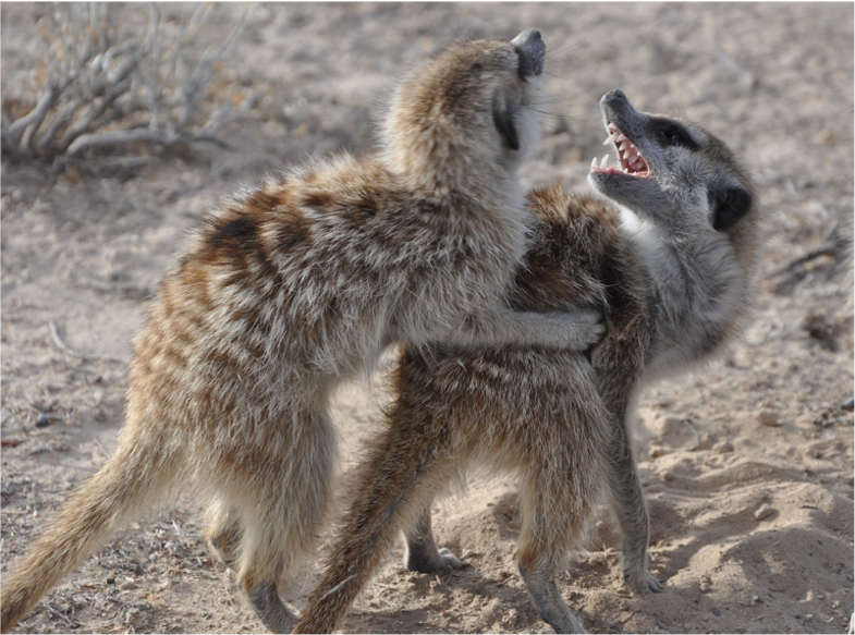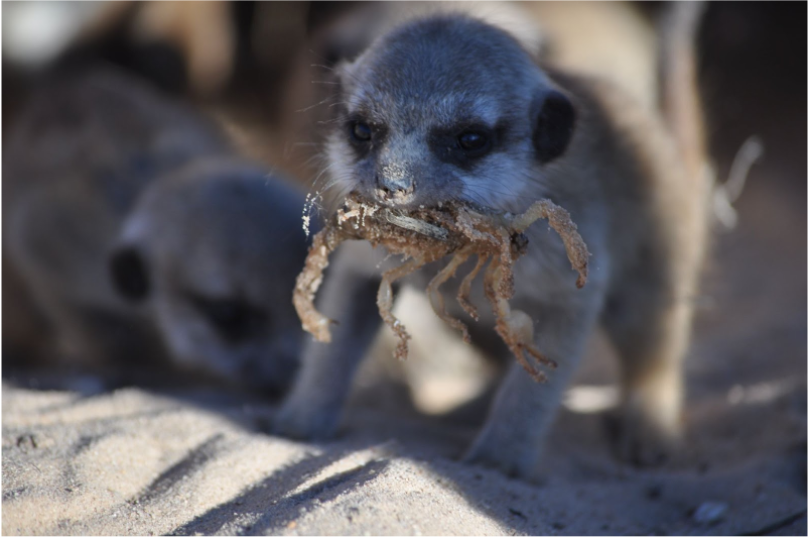 Fig. 4: Meerkat pups eating a scorpion (left) and playing (right) in the Kalahari Desert (Photos by Charli Davies)