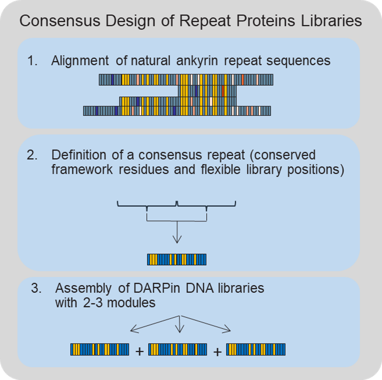 What is a DARPin? A DARPin is the designed protein equivalent of a naturally occurring ankyrin repeat protein (Binz, 2003). Nature has evolved ankyrin repeat proteins for a plethora of functions, with a common theme to use them as molecular interaction mediators, in a way like molecular glue. As such, they are also great enzyme function regulators, or inhibitors, and this is exactly why we built a company around the DARPin platform. The design and invention of the DARPin platform is described in more detail by Binz et al, 2003 (see also Figure 1). In a nutshell, we had derived the theoretical precursor of all naturally occurring ankyrin repeat proteins by simple consensus calculation (i.e. to determine the most frequently occurring natural amino acid in a given position of the protein fold). As the name states, repeat proteins are composed of the same sequence motif, stacked in tandem. To physically generate trillions of different DARPin candidates, which potentially bind to a target protein, we introduced the special feature of well-defined combinations of amino acids at the binding interface employing standard molecular biology techniques. With such a DARPin library, we then performed “molecular evolution in a test tube” experiments to obtain the best suitable lead candidates.