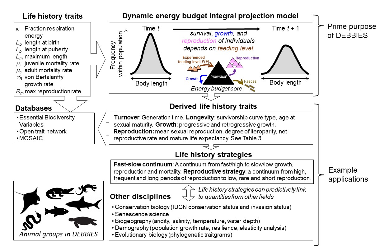 Figure 2. Workflow of parameterising a Dynamic Energy Budget Integral Project Model, DEB-IPM, and example applications, including what databases DEBBIES can feed into (Essential Biodiversity Variables2; MOSAIC3). DEBBIES currently contains 185 ectotherms of 18 different orders. Eight life history trait values (top-left box) are required to parameterise a DEB-IPM (top-right box). Once parameterised, it can be used to calculate a further nine derived life history traits that can in turn be summarised into life history strategies. These, in turn, can be linked to quantities from other disciplines.