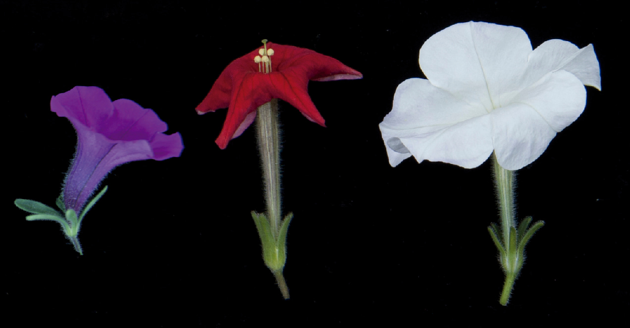 Fig. 1. Three closely related species of Petunia exemplifying transitions in flower tube length, stigma exsertion and colour associated with pollinator shifts. From left to right: P. inflata (bee-pollinated), P. exserta (hummingbird-pollinated) and P. axillaris (moth-pollinated). Photos reproduced with permission from H. Sheehan.