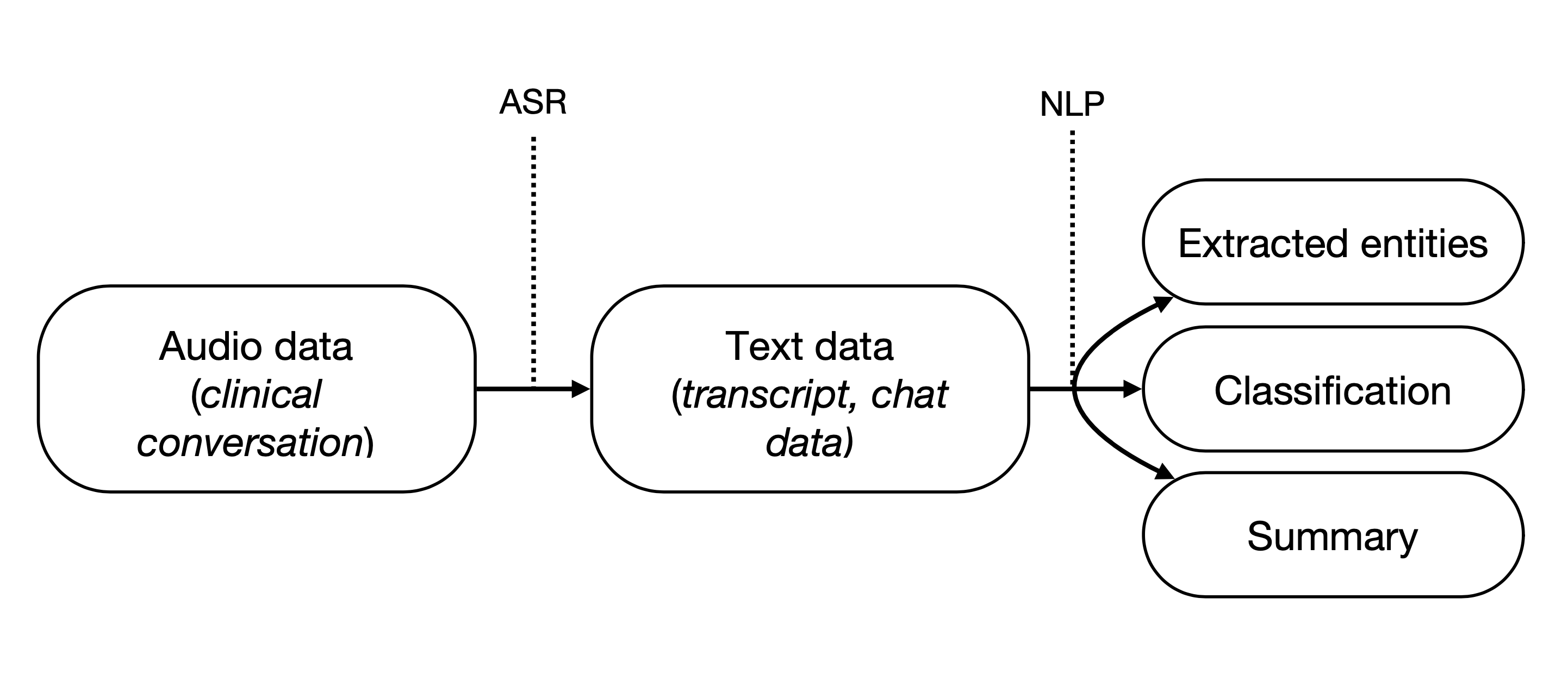 First things first: what is a digital scribe? A digital scribe is a system that supports physicians by automating a part of the clinical documentation task following a clinical conversation. The digital scribe records the conversation using a microphone and automatically transcribes it using automatic speech recognition (ASR). Then, the digital scribe extracts relevant information from the transcript and forms this into a summary. This last step uses natural language processing (NLP), with techniques such as entity extraction, classification, or summarization. In entity extraction, a model is trained to find specific entities in a text, such as names or dates. For a clinical conversation, you could train this model to find symptoms, conditions, and medications. Classification models can classify parts of the transcript as relevant or not or assign them to a specific part of the clinical note, such as the social history. Summarization can be done using a model that extracts sentences from the text (extractive summarization) or generates new sentences (abstractive summarization). The combination of these components is called a digital scribe (see Figure 1).