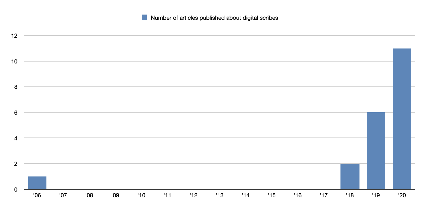 - The previous point also shows the knowledge gap between development and implementation: all published articles focus on the technical validation of their model, while the companies offering a digital scribe don't publish articles at all. The effect of digital scribes on clinical practice thus remains unknown.