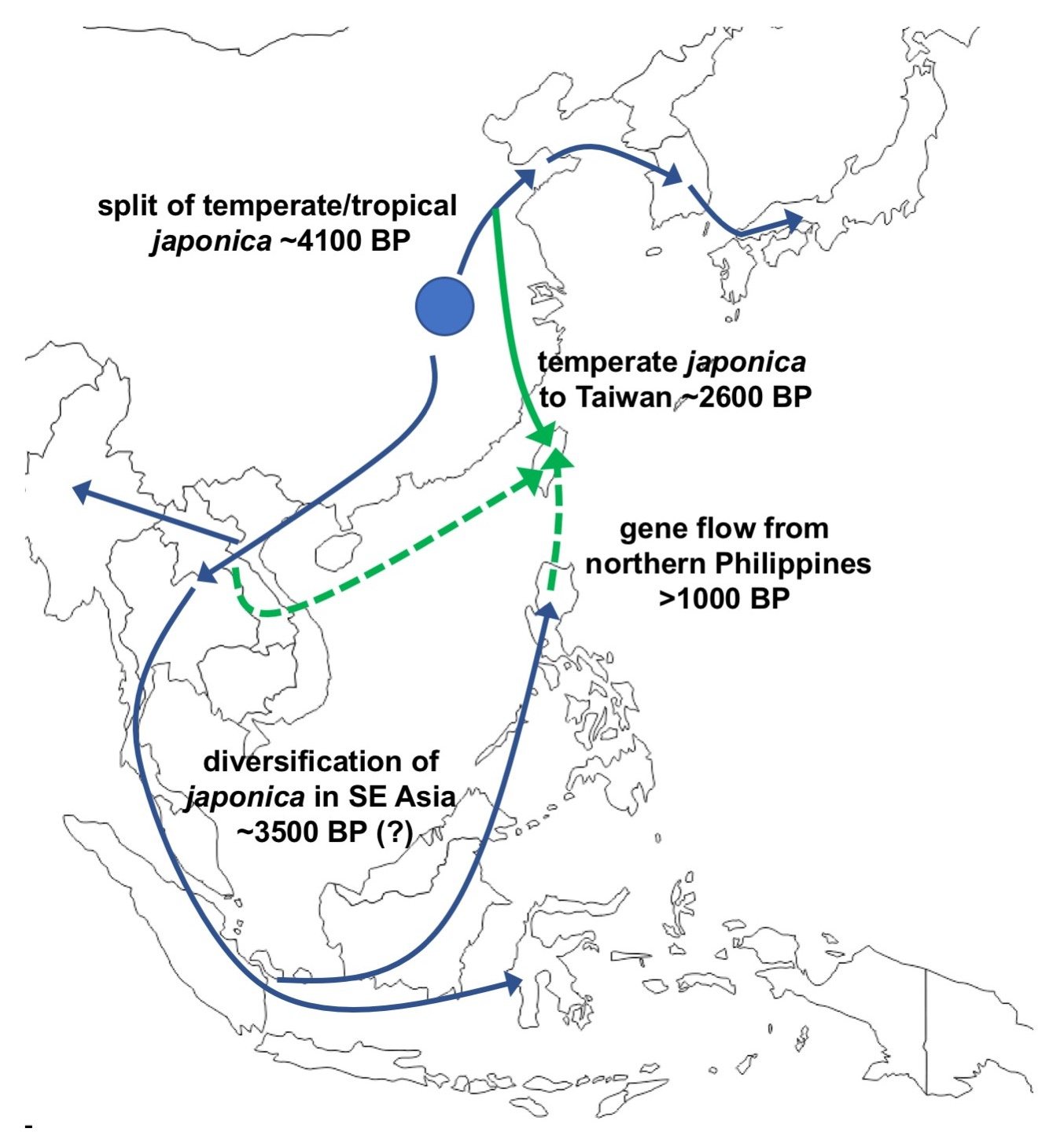 What we also found was that the rice of the northern Philippines did not originate from Taiwan but instead likely came up from the south (Borneo and the Indonesian archipelago). Indeed, our studies suggest that japonica rice in the Philippines may have split off from the Indonesia populations as early as 3500 years ago.