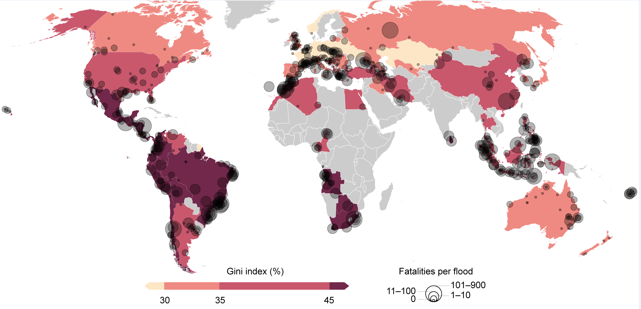 But how could economic inequality within a country influence its flood mortality rates? Research suggests that several factors can come into play, relating to both poverty and the asymmetries per se (Adger and Kelly, 1999; Anbarci, Escaleras and Register, 2005; Kahn, 2005; Collins, 2009; Tselios and Tompkins, 2019). High levels of income inequality often imply that a significant portion of the population lives in poverty, making them more vulnerable during and after a disaster. For instance, individuals living in poverty may lack the necessary resources to prepare for or evacuate during a flood. Power asymmetries typically lead to spatial marginalization in the urban landscape, which can increase the disaster risk. This occurs when resources, services, and flood protection infrastructure are concentrated in high-income neighborhoods, leaving low-income areas behind and at higher risk.
