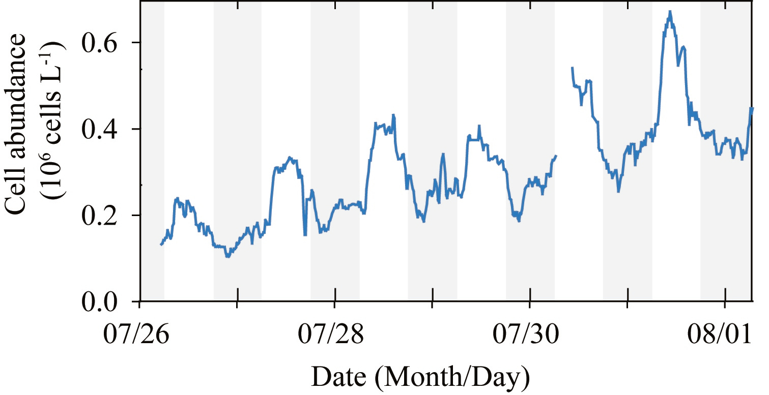 Figure 3. A microbiologists dream come true. Tracking Crocosphaera cell abundances in real-time at 3 minute intervals using the SeaFlow, an underway flow cytometer.