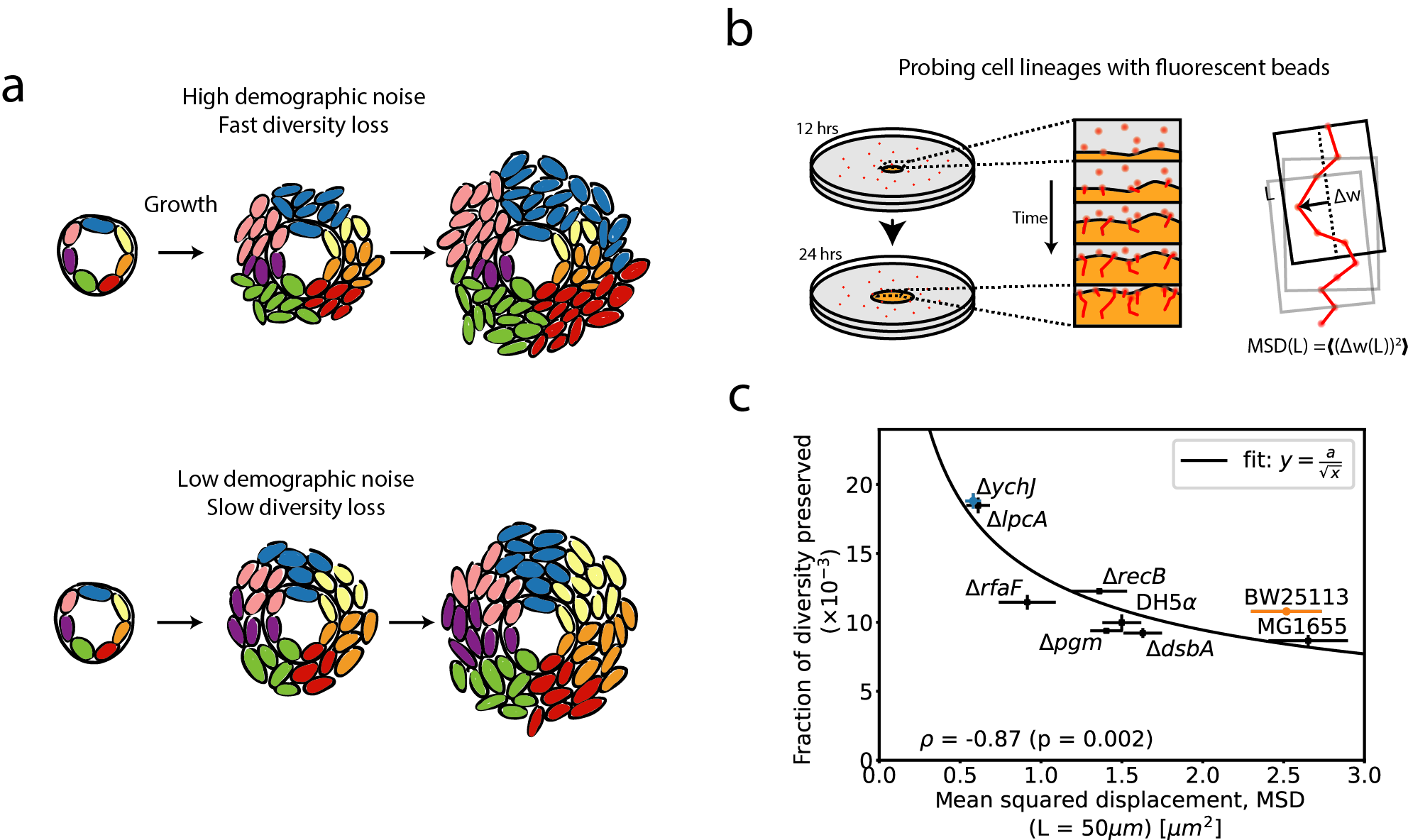 Given the role of genetics in setting the strength of demographic noise, we wondered how much single mutations can have an effect on demographic noise, analogously to studying how mutations affect fitness. We used an established E. coli gene deletion collection called the Keio collection as our model system, because loss of function mutations commonly occur in bacteria in a single mutation event. We wanted to observe the fate of lineages from cells in the initial population of the microbial colonies in order to measure demographic noise, which causes diversity to be lost from the initial population (Figure 2a).