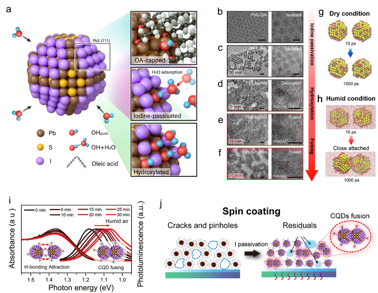 In this study, H-bonded water is identified on the partially hydroxylated surface of PbS CQDs by systematic experimental and theoretical studies as shown in Figure 1a. The results indicate that the adsorbed water could govern the temperature-dependent change of CQD surface chemistry through water desorption, hydroxylation, and dehydration process. More importantly, the transmission electron microscopy (TEM) in Figure 1b-f and the molecular dynamic (MD) simulations in Figure 1g-h suggest that the water molecules could potentially work as H-bonded bridges between CQD, promoting the subsequent CQD close attachment and fusion. The CQD fusion triggered by ambient water leads to inter-band traps in atomic passivated CQD, significantly enhances the Stokes shift and reduces the carrier lifetime in CQD solids (Figure 1i-j).
