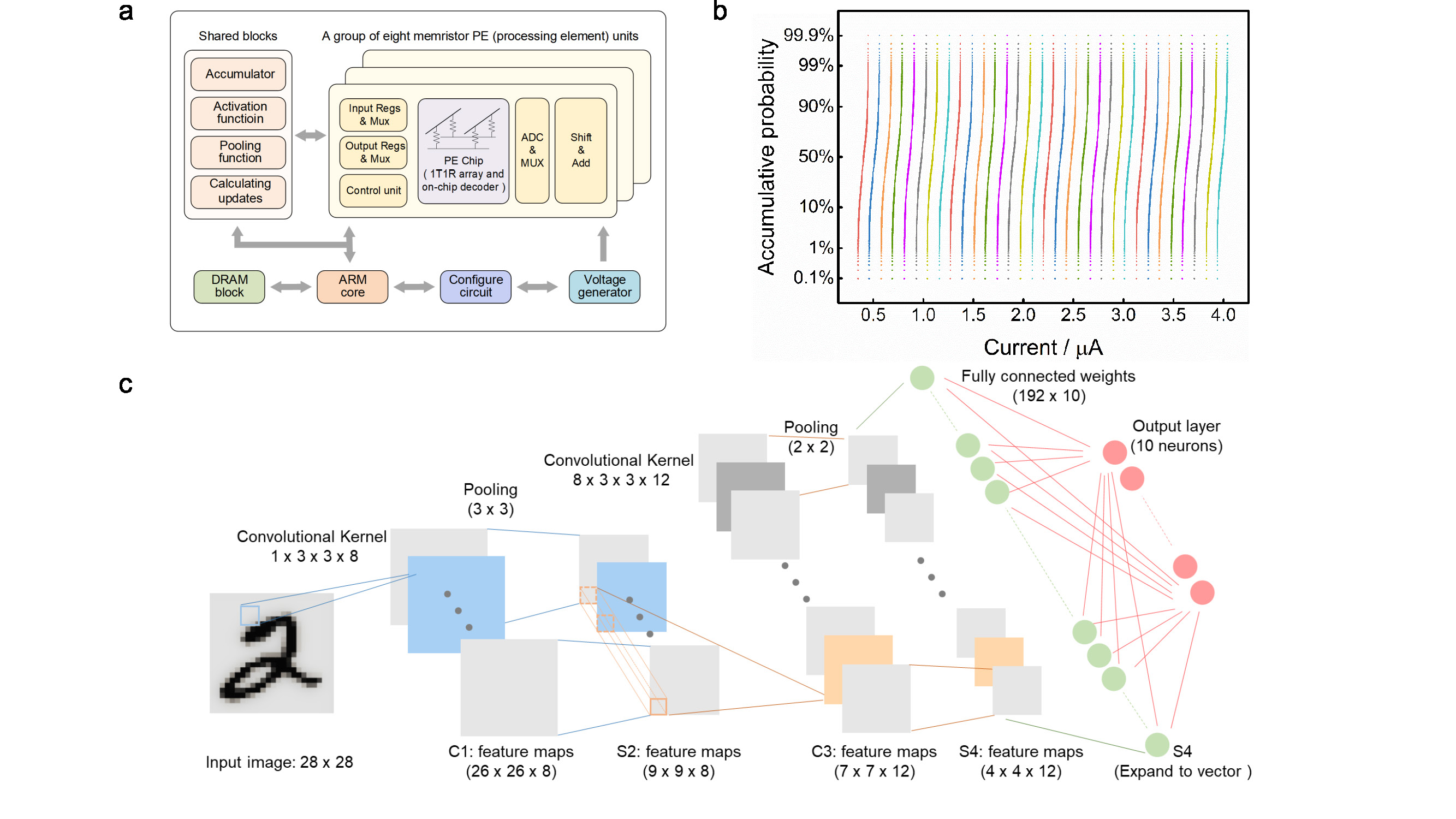 The non-ideal device characteristics are considered as the substantial hurdles to result in the system performance degradation. To circumvent various non-ideal factors, a hybrid training method is proposed to implement the mCNN. In hybrid training, the ex-situ trained weights are firstly transferred to the memristor arrays, and in next phase, only a part of the memristor weights are in-situ trained to recovery the system accuracy loss due to device non-ideal characteristics. In this work, only the last FC layer is in-situ trained.