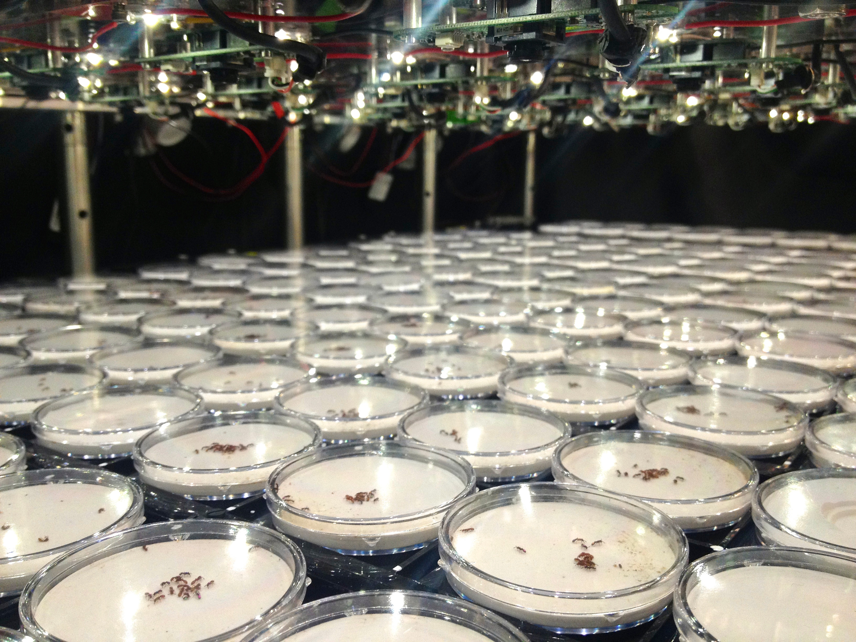 With this convenient species, we set out to measure division of labor and fitness in experimental colonies over a size range corresponding to the onset of group-living (1 to 16 ants). Measuring fitness was straightforward, but the tools needed to measure behavior and division of labor were not available. So together with Jonathan Saragosti, a postdoc in the lab with a background in physics, we developed them from scratch. There were of course some trials, errors, and initial setbacks, including the accidental discovery that some types of silicon are highly toxic to ants, a long quest for the best ant paint, and much drama involving a climate room with an attitude. But we eventually succeeded in developing a setup to record images from many colonies in parallel (Photo 2, Video 1-2), software to detect and identify each ant in those images, and statistical methods to analyze the resulting data.