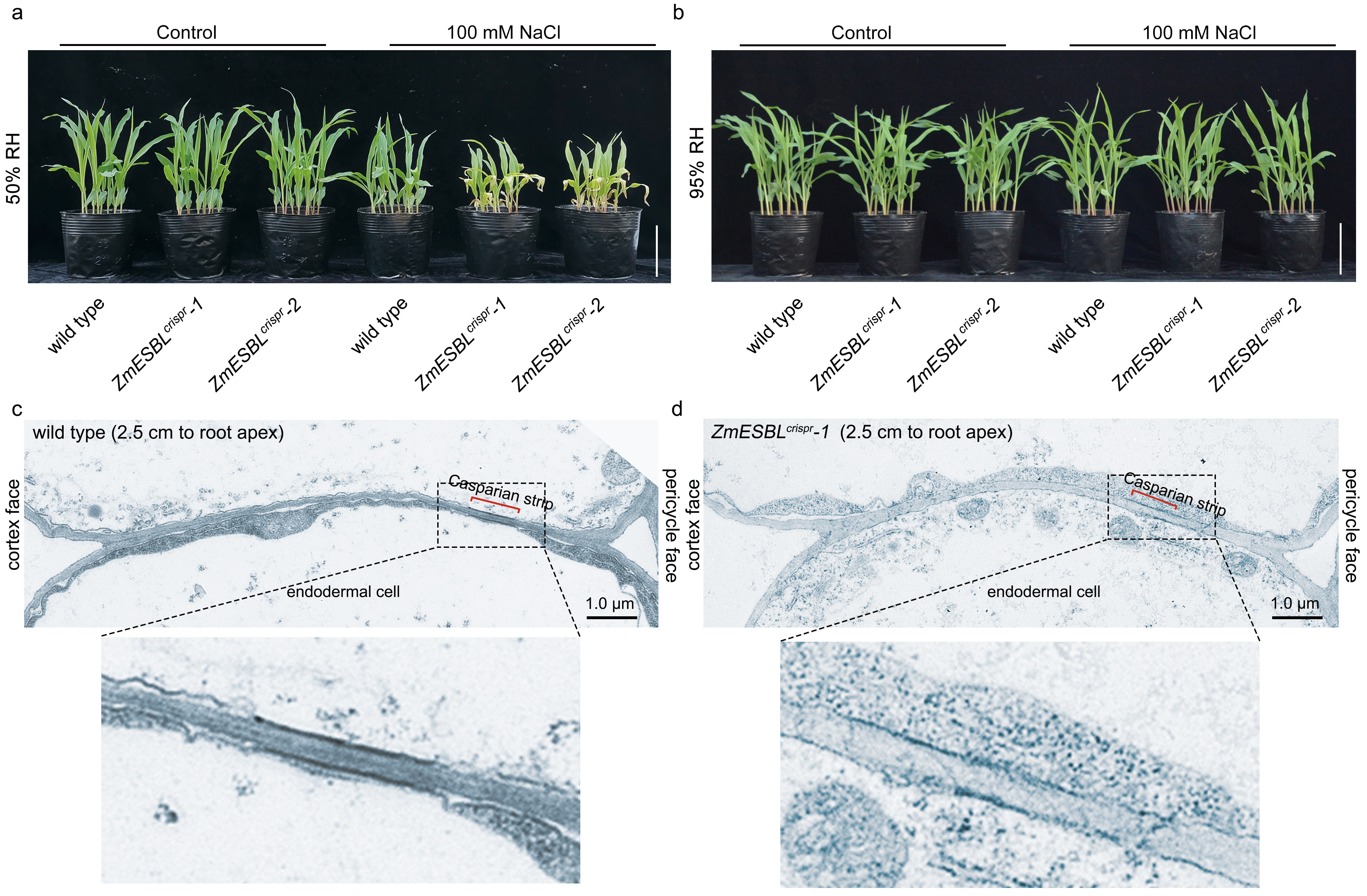 Figure 1. Loss-of-function of ZmESBL impairs endodermal CS barrier, thereby leading to a salt hypersensitivity phenotype under high transpiring condition. a,b The appearances of ZmESBLcrispr and wild-type plants with the indicated treatments. c,d Assays of the endodermal Casparian strips. RH, relative humidity.