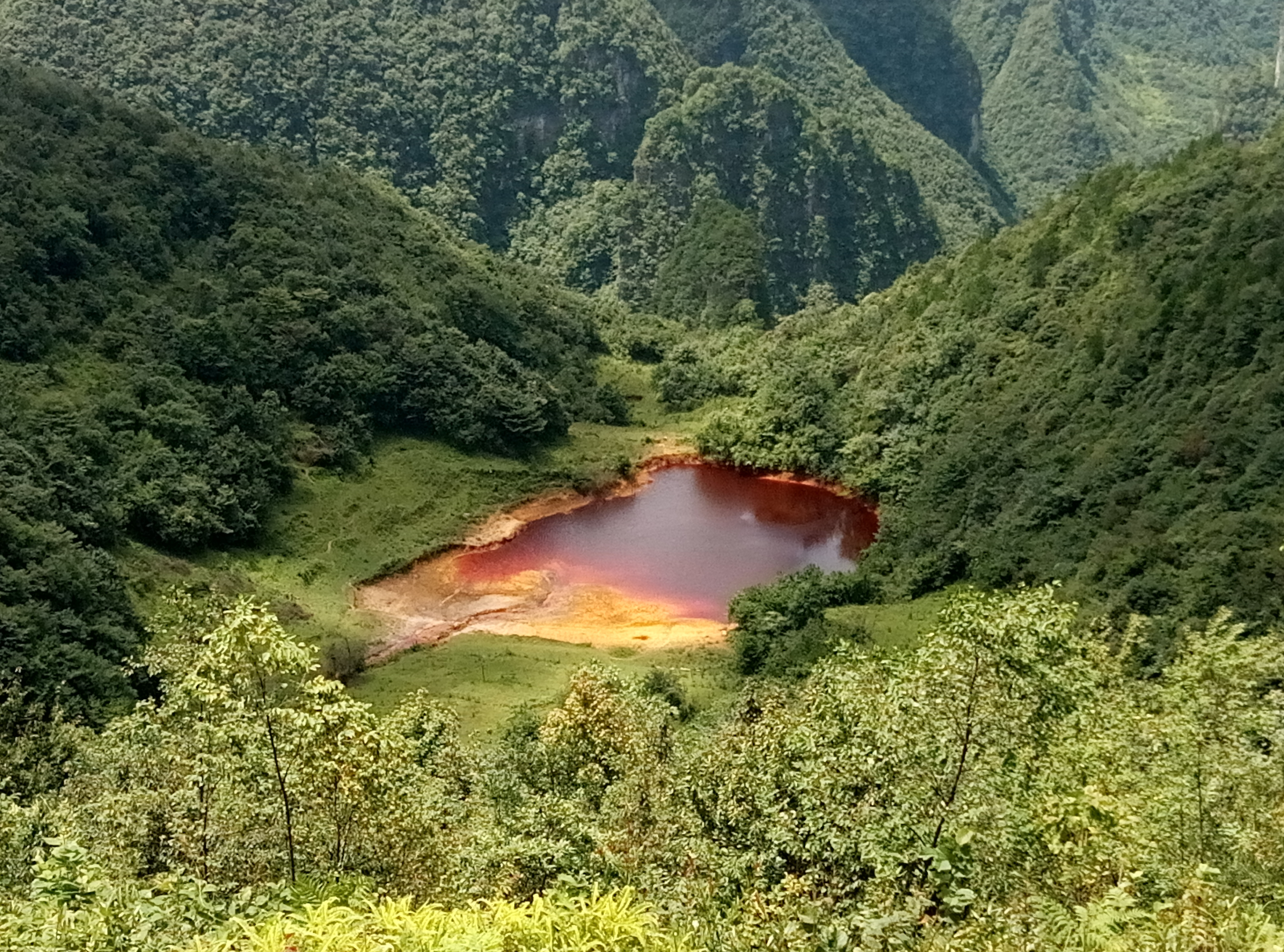 Photo 1: An acid mine drainage pool generated by naturally rain scouring of an abandoned gangue mine. (Photo credit: Wen-Kai Teng)