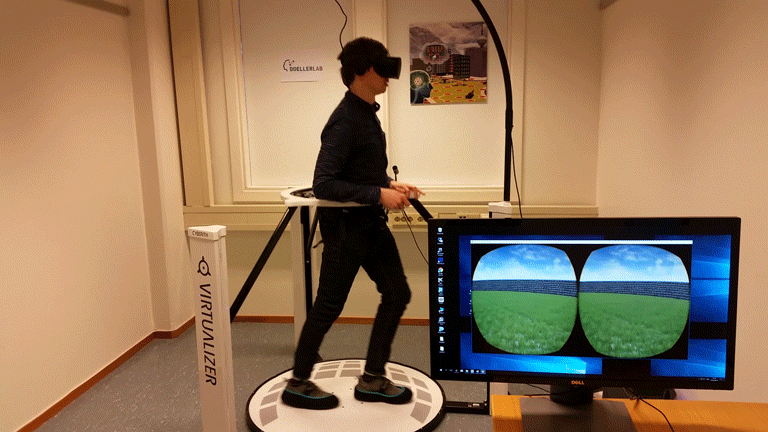 To test this, we used highly immersive virtual reality. Participants navigated through a square and a trapezoidal virtual environment on a treadmill-like motion platform that translated their steps and rotations into virtual movement (see GIF). Each environment contained six objects, the positions of which were to be learned. We found that memory for object positions was worse in the trapezoid environment. Importantly, errors were particularly large in the narrow end of the environment, mirroring the strength of the distortions observed in the navigating rodents.