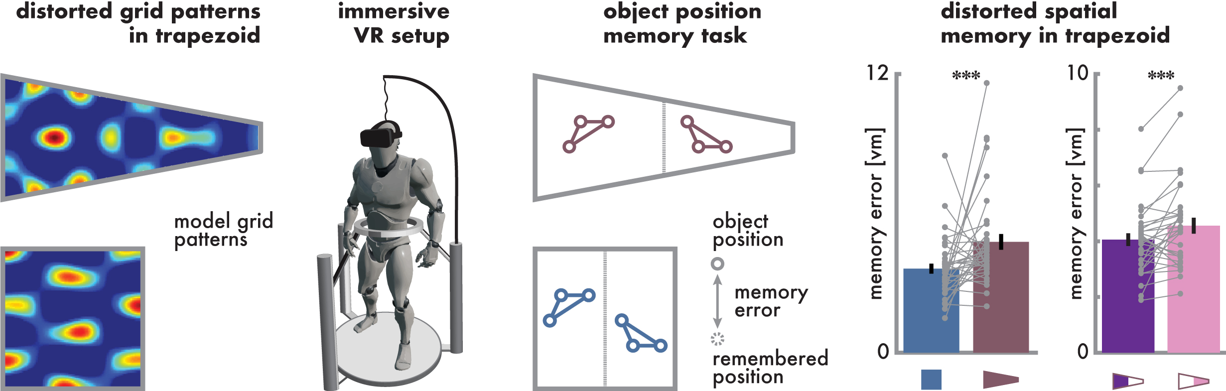 Left: the regularity of grid-cell firing patterns is distorted in a trapezoid compared to the square. Center-left & right: in our immersive virtual reality setup, participants learned object positions (circles) in a square and a trapezoidal environment. Right: participants made larger errors for objects in the trapezoid environment. Paralleling the distortions of grid patterns, the accuracy of participants’ spatial memory was particularly low in the narrow end of the trapezoid.