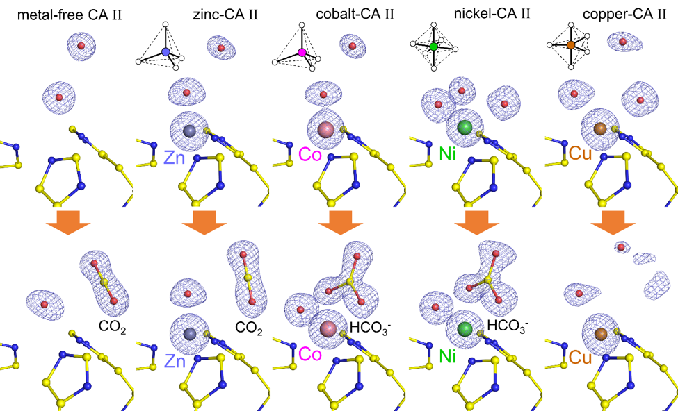Hence, in this study, we wanted to examine structurally the role of metal ions in CA II, and as such we selected four divalent transition-metal ions; zinc, cobalt, nickel, and copper, that alter CA II activity from 100, ~50, ~2, and 0%, respectively (Lindskog and Nyman, 1964). To achieve this, we utilized X-ray crystallography to examine the catalytic intermediate states of the metal-free and the four metal-bound CA II by cryocooling the crystals under CO2 pressures ranging from 0 (no CO2pressurization) to 20 atm.