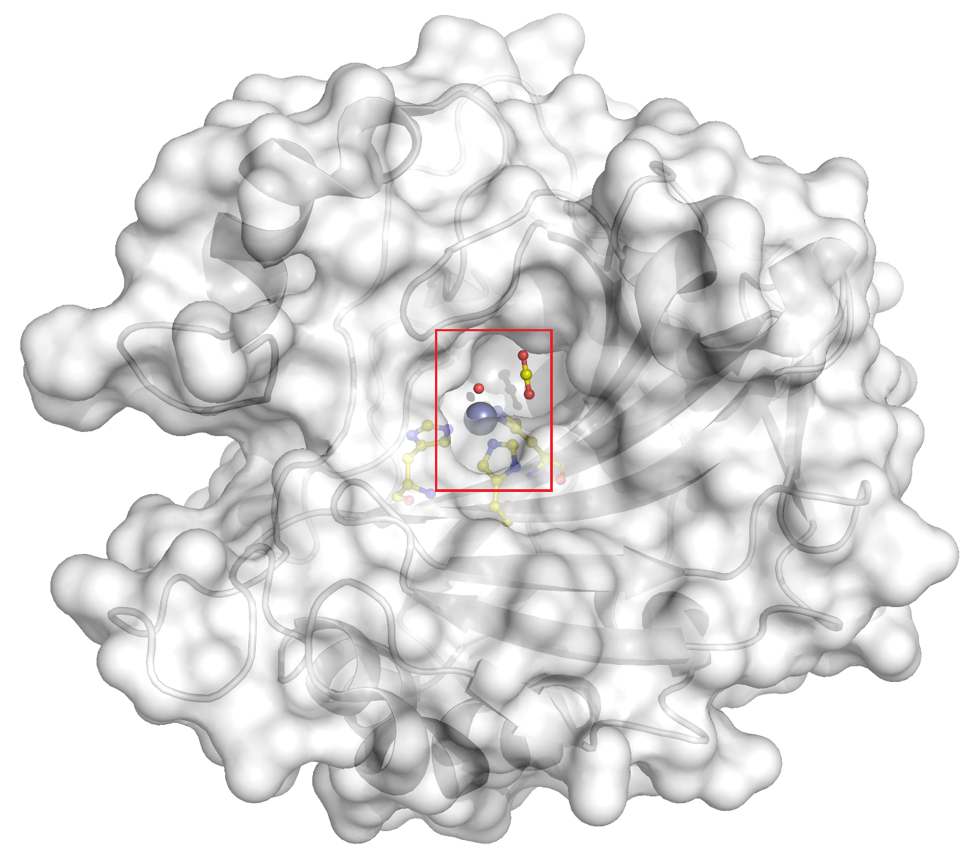 Fig. 1. Overall structure of zinc-CA II. Shown CO2located in the active site (red box).