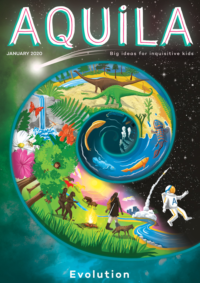 I’ve been meaning to get my hands on a copy of Aquila for some time, as my children are just coming into the right age bracket (8-12). So, when I saw that January’s topic was Evolution, I jumped at the opportunity. I wanted to check out how they went about engaging children with a serious and sometimes difficult scientific topic, do a pedantic check for accuracy, and also see if the magazine really is as beautiful as it looks in the adverts.