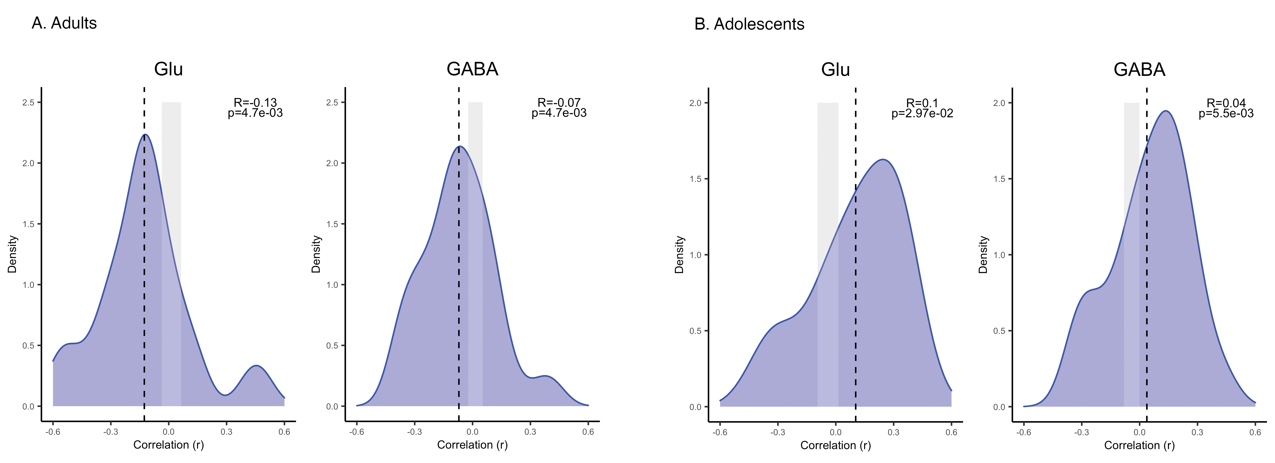 Glutamate and GABA genes were differently linked to autism behaviors. In the gene-set analysis we found that the genetic variation of the glutamate gene-set was linked to all the diagnostic interview scores; ADI-R (Autism Diagnostic Interview - revised) and ADOS-2 (these are interviews typically used to diagnose autism). The GABA gene-set was associated with sensory processing differences, although this was a weaker association that did not survive correcting for multiple tests. However, GABA concentrations have been linked to sensory processing previously as well. So, the genetic variation of the glutamate genes were linked to broader autism characteristics, whereas the GABA genetic variation was associated with sensory processing. In the gene-expression analyses we saw that more gene-expression of both glutamate and GABA genes was correlated with larger differences in cortical thickness. However, this effect was different across ages. In adolescence, this effect was positive, suggesting larger cortical thickness in the non-autistic participants, whereas in adults this effect was negative indicating larger cortical thickness in the autistic participants. You can see this in Figure 1, and in more detail across brain regions in Figure 2.