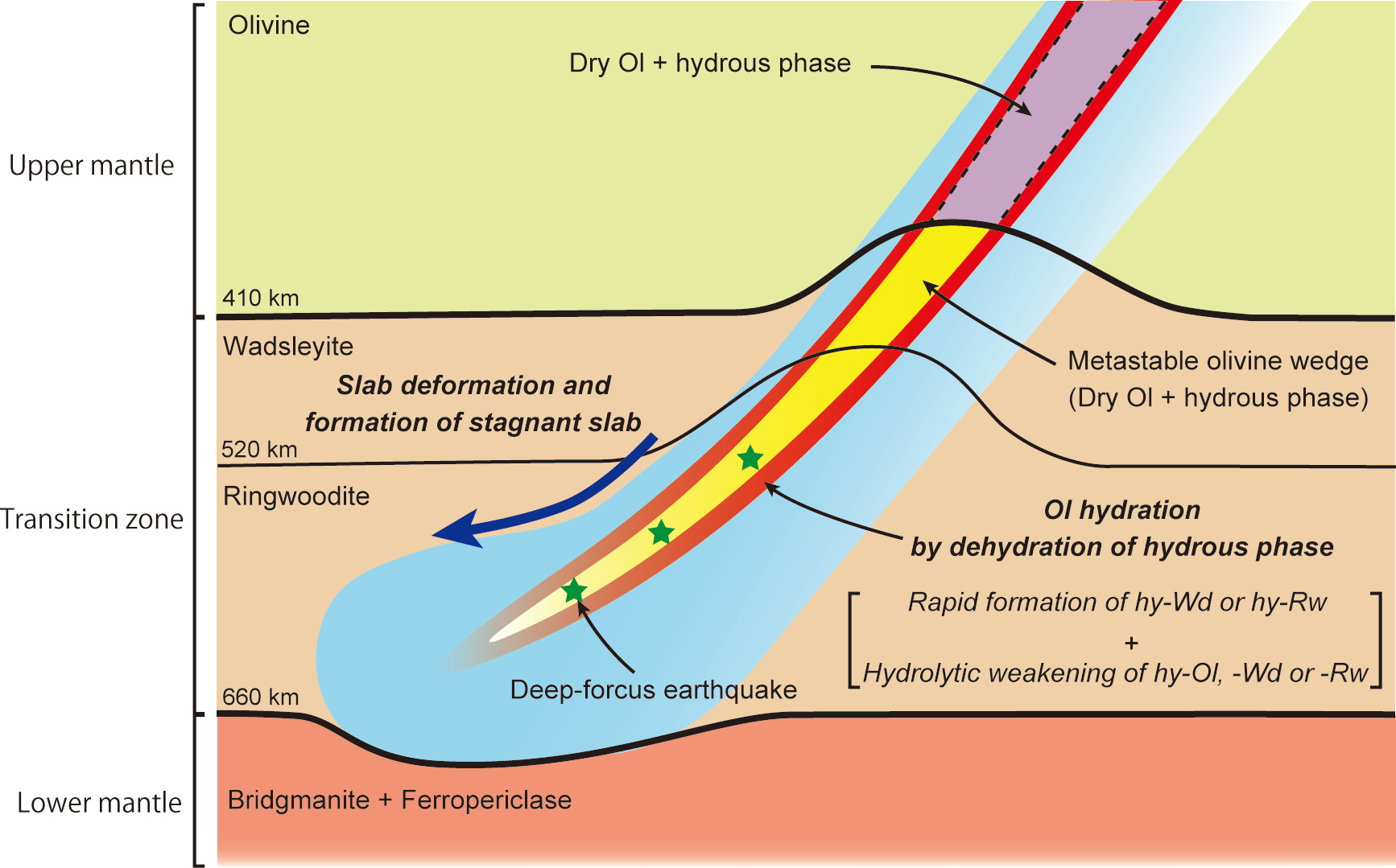 We conducted high pressure-temperature experiments to reproduce the inside of a wet plate and determined the water content of olivine synthesized under conditions coexisting with hydrous phase A, one of the major hydrous minerals. We determined the water content of olivine. The results show that, contrary to previous expectations, olivine has a very limited water content of less than 1/10,000 percent. This result indicates that dry olivine exists even in a wet plate, and that a phase transition of dry metastable olivine can explain the occurrence of deep earthquakes. The large deformation and stagnation of the plate around 660 km depth is also caused by the phase transition of metastable olivine and the softening of olivine by fluid water generated by the dehydration of hydrous minerals in the warming plate.