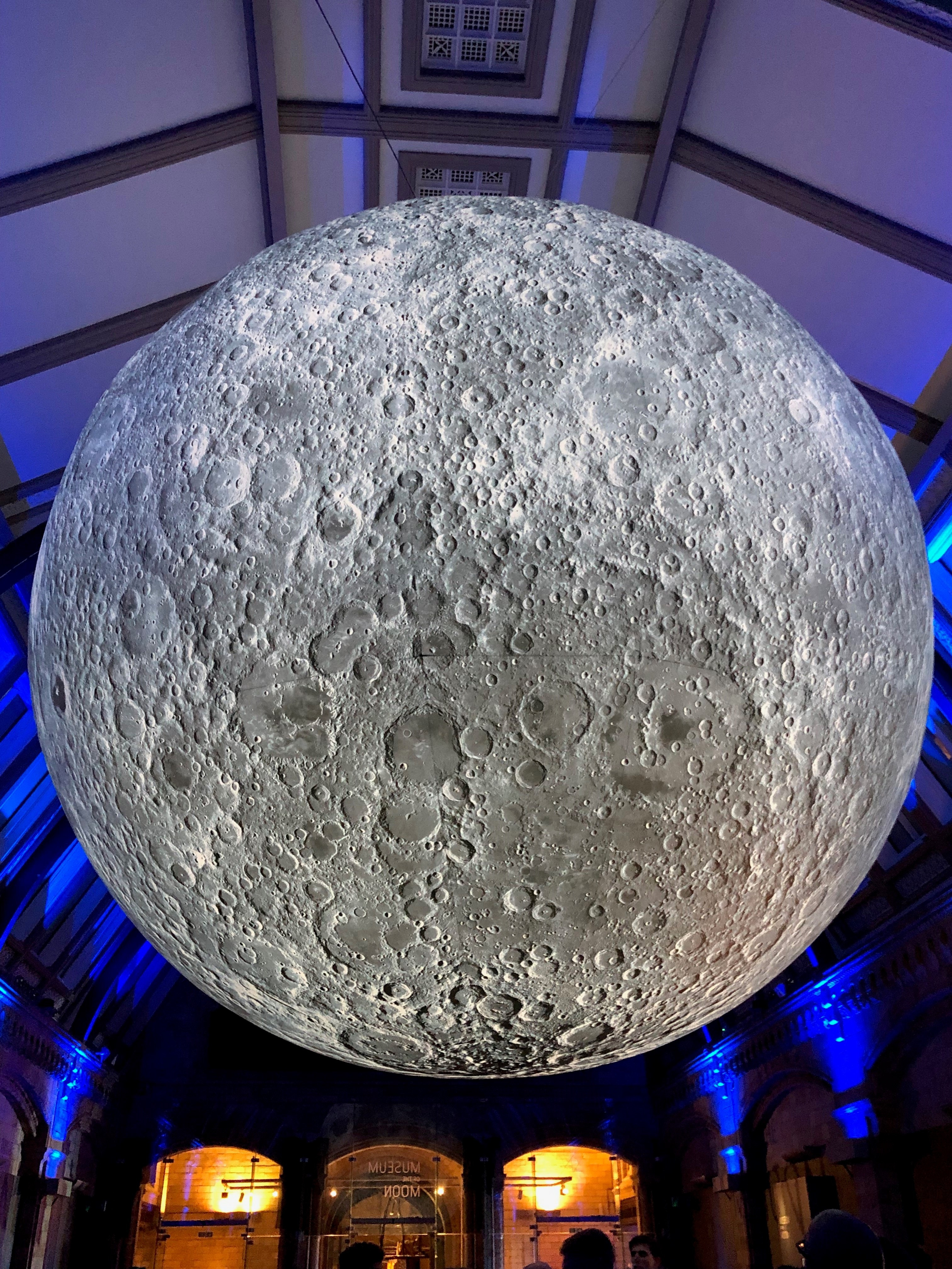 It turns out that the artist, Luke Jerram, had wanted to make such a large-scale Moon for twenty years, but the technology has only just caught up with his vision. His upbringing in Bristol, where the Severn rises and falls by up to 15 m, brought an awareness of our deep relationship with the Moon. He has been touring the world with his model of the Moon, from churches to museums. See it now, for free, at the Natural History Museum (until 1 January 2020): https://www.nhm.ac.uk/visit/exhibitions/museum-of-the-moon.html