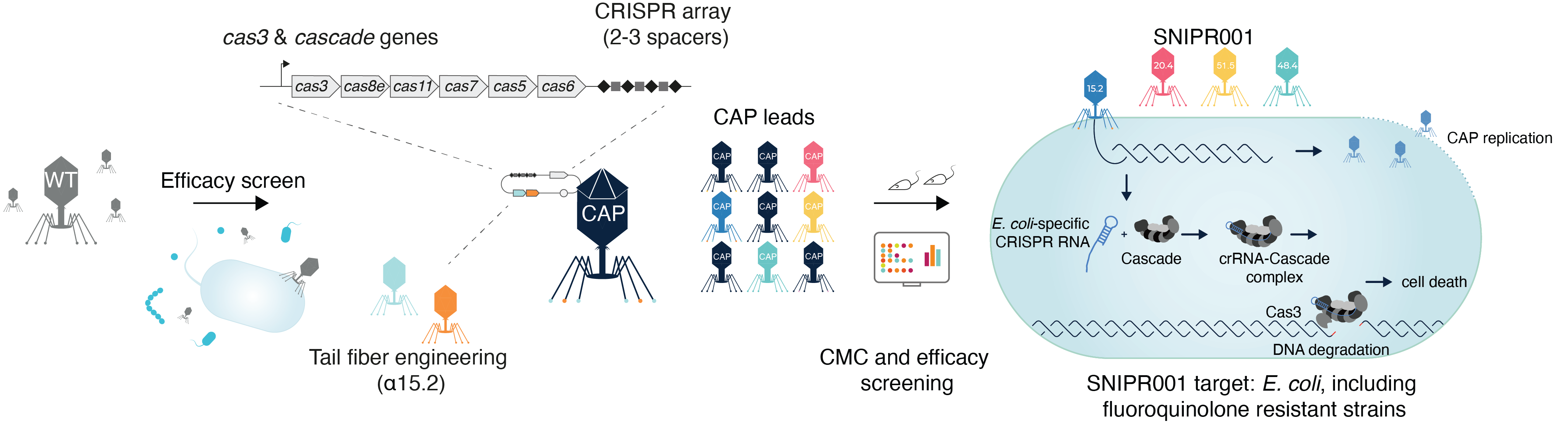 Figure 1: An overview of the SNIPR001 creation process. First, WT phages are screened against a panel of E. coli strains. Then, phages with broad activity against E. coli are tail fiber engineered and/or armed with CRISPR-Cas systems containing sequences specific to E. coli, creating CRISPR-Cas-Armed Phages (CAPs). These CAPs are then tested for host-range, in vivo efficacy, and chemistry, manufacturing, and control (CMC) specifications. SNIPR001 comprises four complementary CAPs and is a novel precision-antibiotic that selectively targets E. coli to prevent bacteremia in hematological cancer patients at risk of neutropenia.