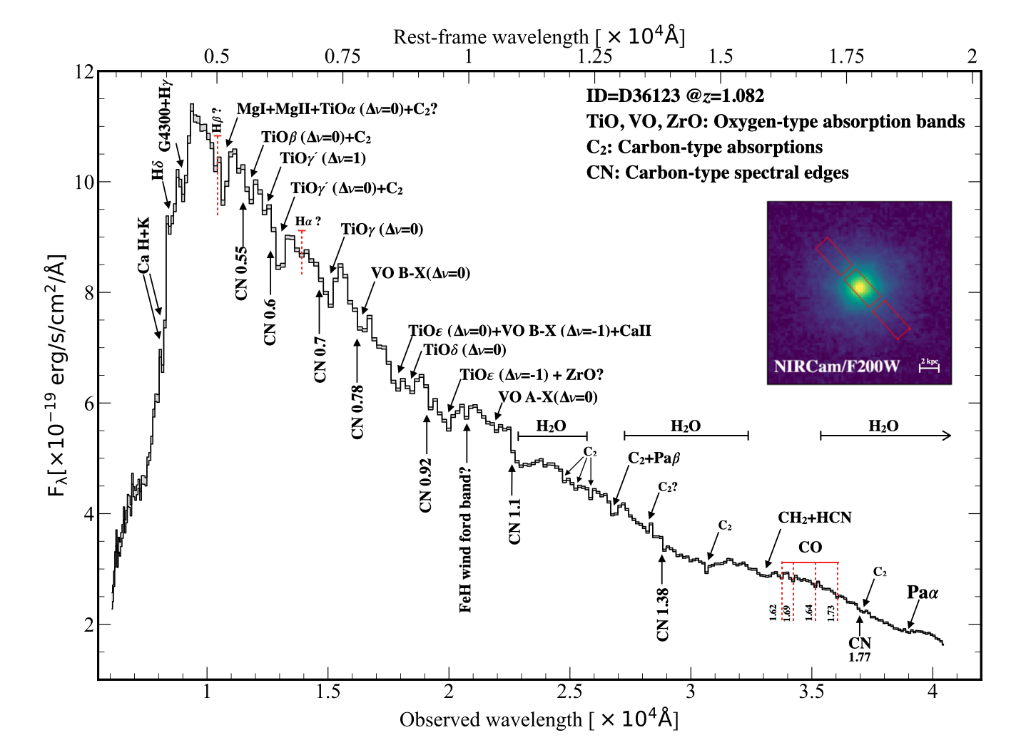 Fig.2 | NIR rest-frame spectrum of the quiescent galaxy D36123 at z=1.082. The spectrum is plotted as a double histogram corresponding to the ±1σ noise, showing its exceptionally high quality. Numerous broad absorptions and spectral discontinuities in the NIR are specific spectral signatures from TP-AGB stars: multiple TiO absorptions accompanied by deep CN and C2 features are detected for the first time in the spectrum of distant galaxies. The presence of VO and ZrO features also indicates the prominence of the TP-AGB phase. The inset from JWST imaging observations with NIRCam presents the compact quiescent galaxy morphology of D36123. (Credited: Shiying Lu).