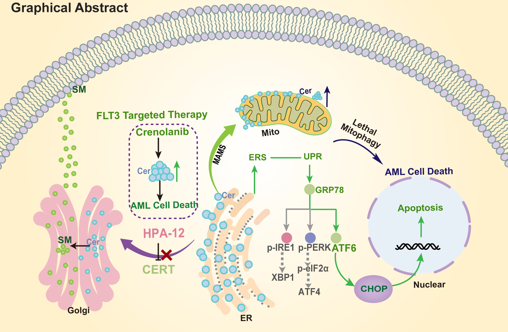 We have provided evidence for strategies targeting the clearance of Cer to treat AML, especially for patients with FLT3 mutations. An inhibitor of the Cer trafficking protein CERT in collaboration with FLT3 inhibitors may represent a promising combinatory regimen to reduce the possibility of relapse and resistance.