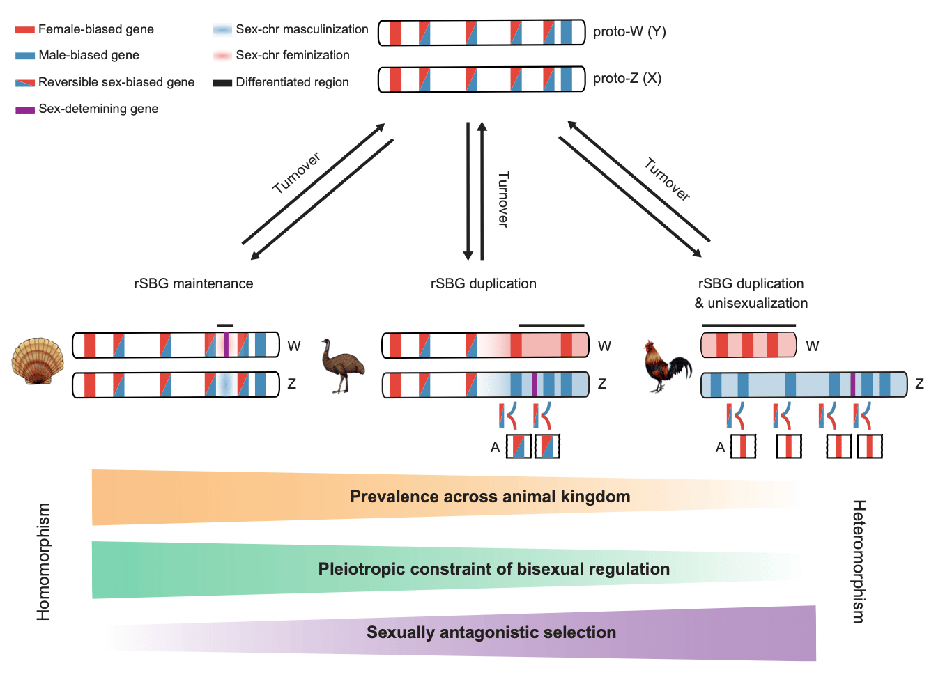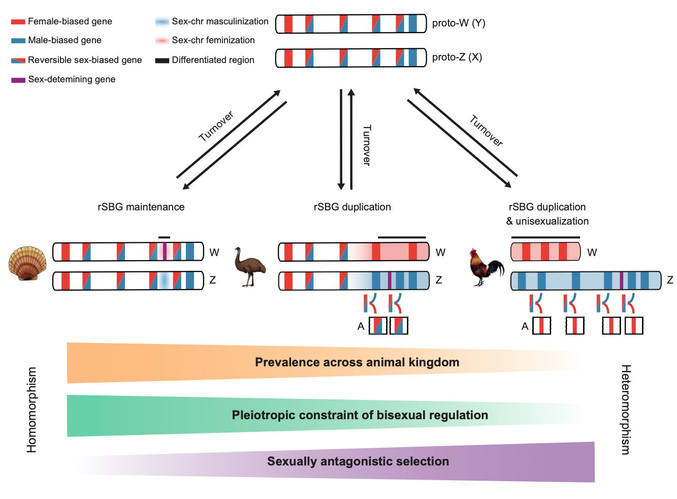 So, how could scallop sex chromosomes remain undifferentiated for 350 million years? Answering this question not only helps to understand the maintenance mechanism of homomorphic sex chromosomes, but also fills up a knowledge gap on the evolutionary puzzle of sex chromosomes from homomorphic to heteromorphic. We innovatively adopted a dynamic analytical strategy to profile gonad developmental transcriptome, and found a large number of reversible sex-biased genes (rSBGs) on homomorphic chromosomes (sex preference switches between males and females at different stages of gonad development), while only few on heteromorphic sex chromosomes. By comparing the genome distribution and expression patterns of rSBGs in scallops, fruit fly, fish, birds, human, etc., we revealed that rSBGs could play a “barrier” role to restrict the expansion of the recombination suppression region of sex chromosomes and thus maintain the undifferentiated status of sex chromosomes. It clarified that the process of sex chromosomes from homomorphic to heteromorphic requires the drive of sexual dimorphism and sexual selection pressure, and the sex conflicts of rSBGs could be resolved by subfunctionalization after gene doubling. Our findings lead to a novel evolutionary model for homomorphic and heteromorphic sex chromosomes (Figure 2).