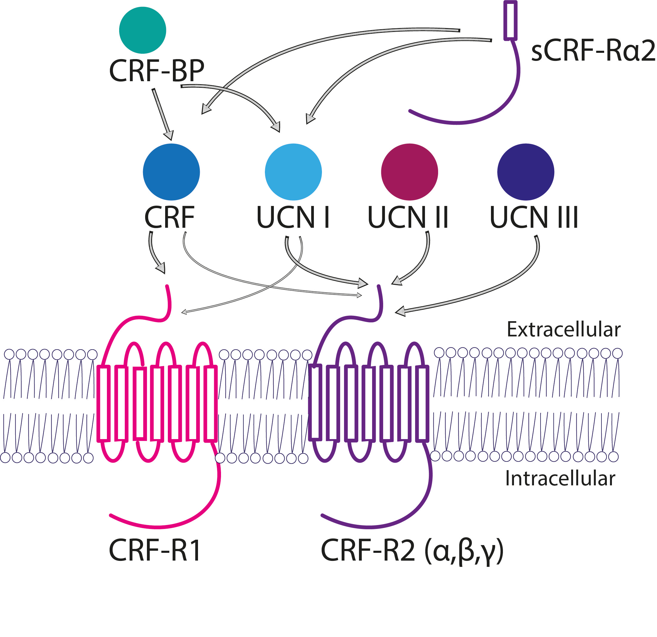 Figure 2: The CRF-peptide family. CRF and CRF-ligands can be activated by two different G-protein coupled receptors CRF-R1 and CRF-R2, respectively. CRF-ligands have different affinities for both receptors, those affinities are represented by the thickness of the arrows. CRF-R1 and/or CRF-R2 activation enables different G-protein signalling cascades. Abbreviations: corticotropin-releasing factor (CRF), urocortin (UCN), CRF receptor 1 (CRF-R1), CRF receptor 2 (CRF-R2), CRF-binding protein (CRF-BP), α-soluble isoform of CRF-R2 (sCRF-Rα2). ( Vandael and Gounko 2019).