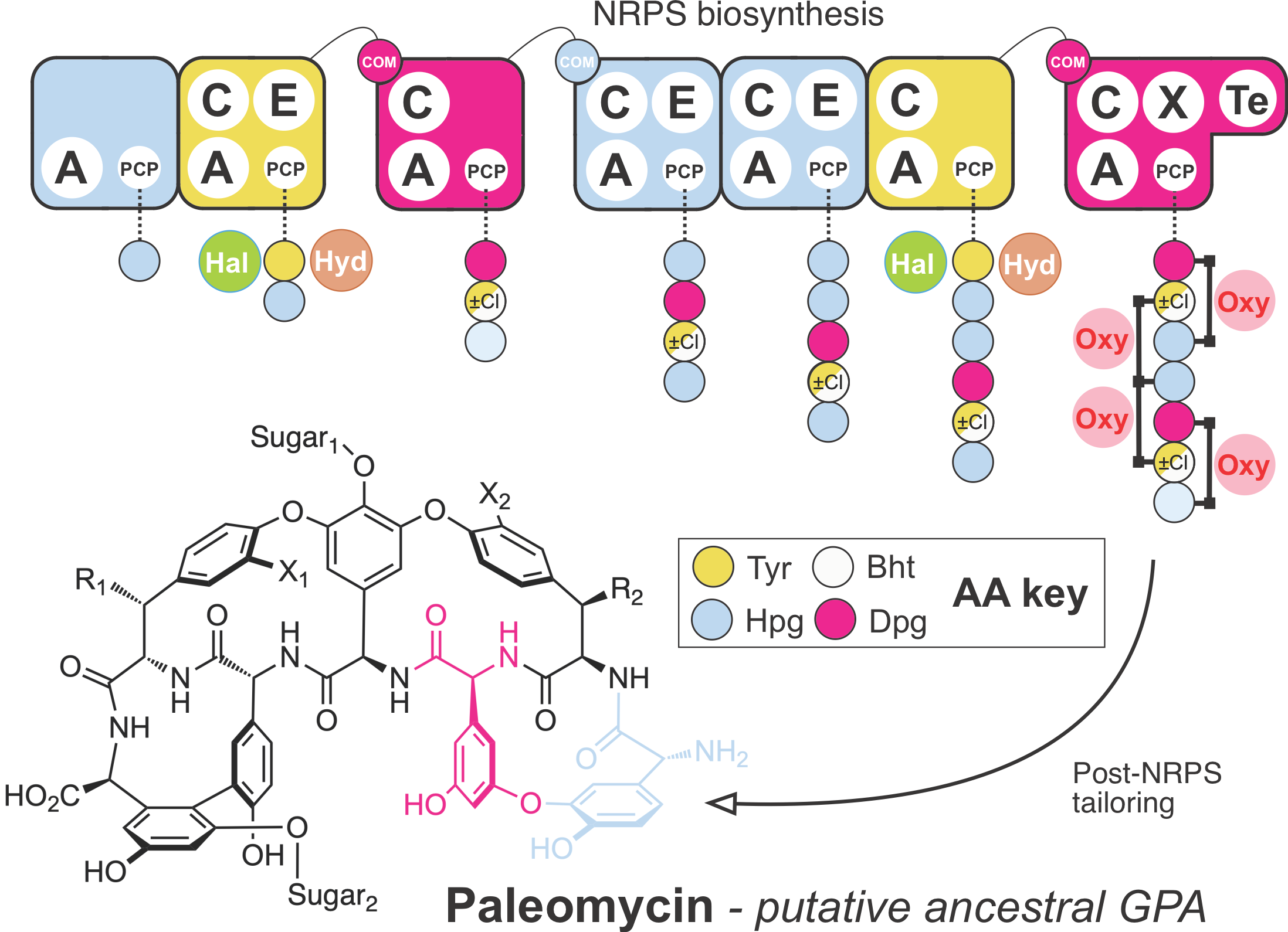 Figure 1: Overview of the modular structure of paleomycin-synthesizing NRPS. The modules of the NRPS are shown in different colors according to the amino acid (AA) they incorporated and the different catalytic domains within each module indicated as adenylation (A), condensation (C) and epimerization (E). Anchored to the peptidyl carrier protein (PCP) domain of each module is the growing peptidic chain. Green and brown circles indicate the enzymes halogenase (Hal) and hydroxylase (Hyd) catalyzing the chlorination and hydroxylation of the first amino acid, respectively. Crosslinks between amino acids are shown in the final peptide on the left, catalyzed by the oxygenases (Oxy). Com; communication domains between the individual NRPSs; X; recruitment domain for the oxygenases; Te; thioesterase, releasing the peptide from the NRPS; Tyr: Tyrosine; Hpg: hydroxyphenylglycine; Dpg: 3,5-dihydroxyphenylglycine; Bht: b-hydroxytyrosine.