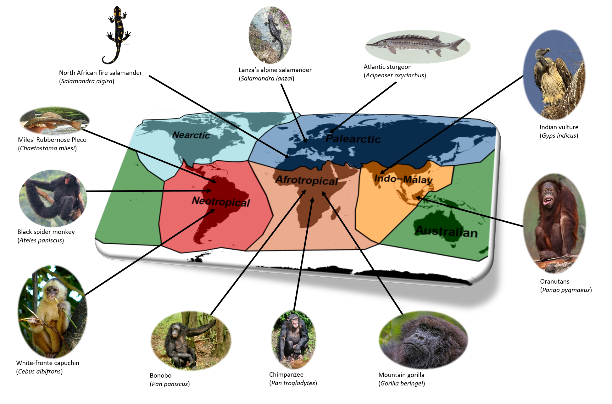 For reptiles, amphibians and freshwater fishes, the changes of functional diversity were more even across the world but affecting different kind of species. For instance, many large-bodied freshwater fishes, such as sturgeons (Acipenser spp.), are threatened in the Palearctic, whereas many small-bodied species, such as suckermouth armoured catfishes (Chaetostoma spp.), are threatened in the Neotropics. The Palearctic was the most impacted realms for amphibians because threatened species host a unique set of functional traits, while being functionally redundant with non-threatened species in the other realms. For example, the functional traits, such as viviparity and low fecundity of some threatened amphibian species such as salamanders (Salamandra lanzai or S. algira) are unique in the Palearctic, whereas similar traits are filled by another amphibian species in tropics, such as the caecilians in Afrotropical, Neotropical and Indo-Malay.