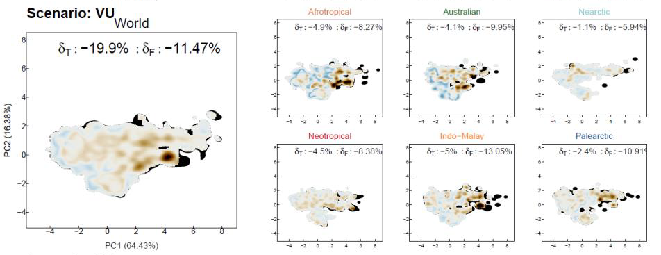 Fig. 3: Example of shifts in the functional diversity after the simulated extinction of threatened species for mammals (Toussaint et al. 2021).
