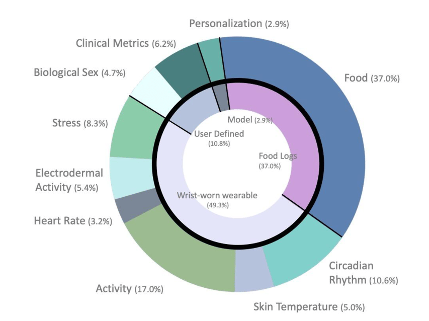 Figure 2. Importance of 69 domain-driven and data-driven features in glucose predictions. Importance was determined from a random forest feature selection model using impurity-based feature selection. The outer circle shows the relative contribution of food, circadian rhythm, activity, stress, gender, clinical metrics, personalization, electrodermal activity, heart rate, and skin temperature to the accuracy of the models. The inner circle shows the relative importance by source of features, including food logs, the wrist-worn wearable, user-defined features, and features defined for/by the model.