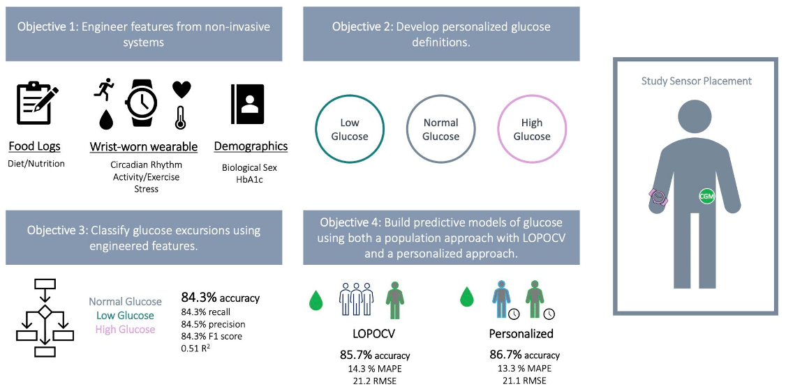 Figure 1.This study has four objectives: 1) Engineer features from non-invasive systems using a combined data-driven and domain-driven feature engineering approach. 2) Develop personalized glucose excursion definitions. 3) Classify glucose excursions using engineered features. 4) Build predictive models of glucose using both a population approach with leave-one-person-out cross validation and a personalized approach.