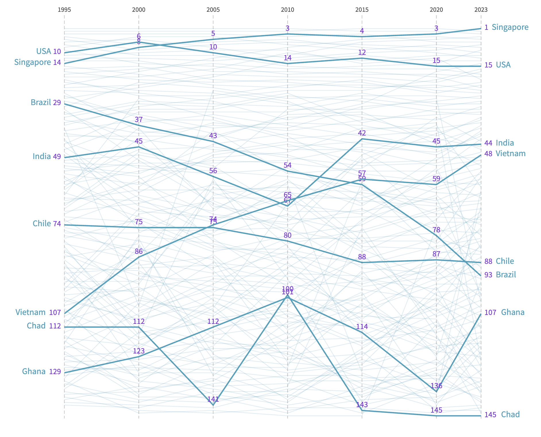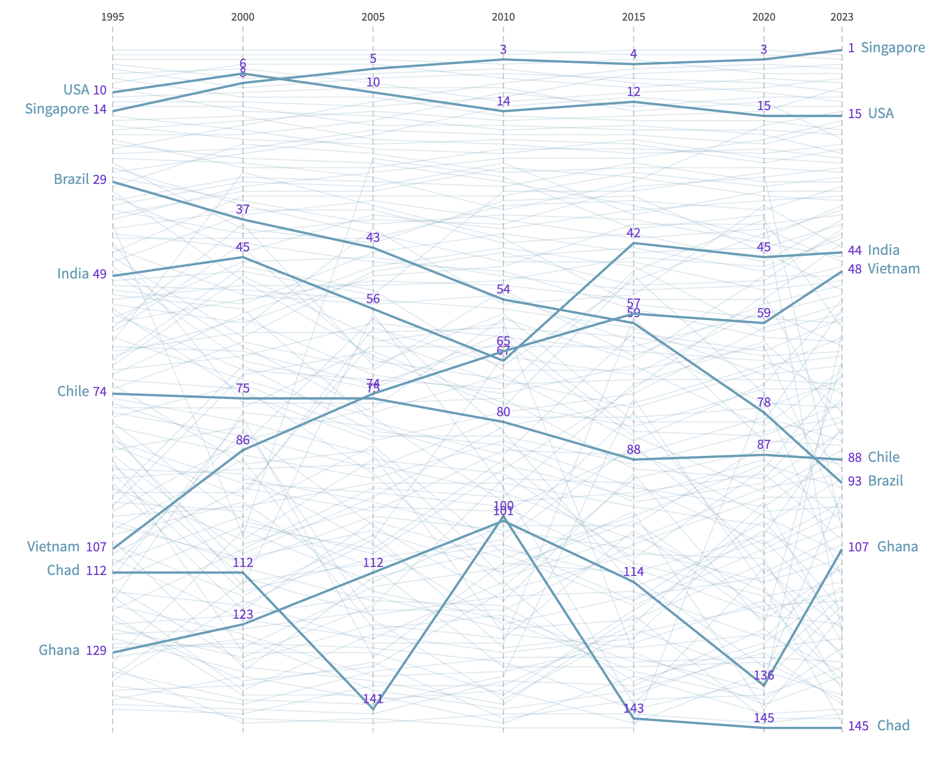Fig. 1 Economic Complexity Index among different selected countries, from 1995 to 2023.
